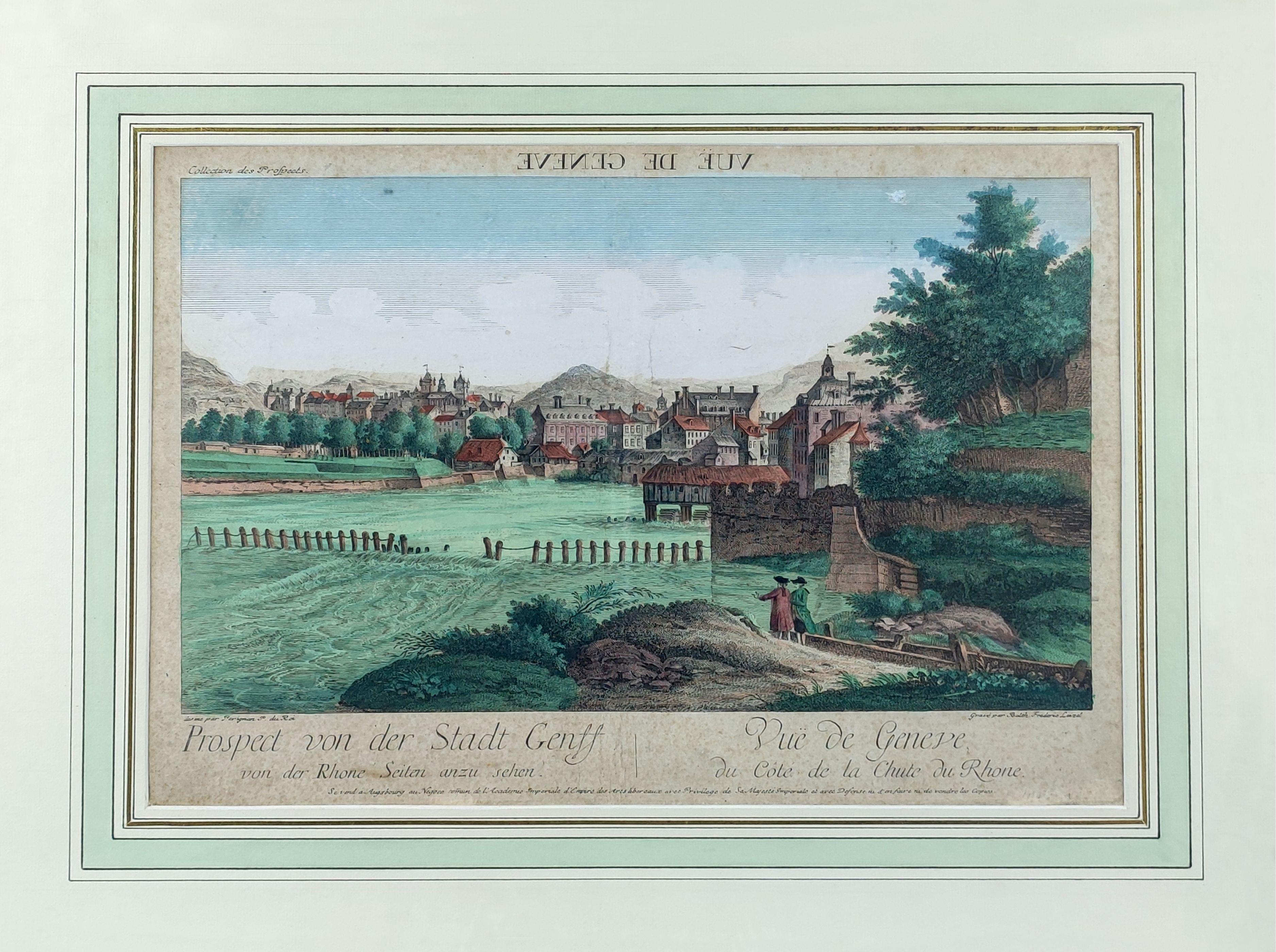 Vue de Genève du côté de la chute du Rhône, eau-forte aquarellée, 30x42 cm