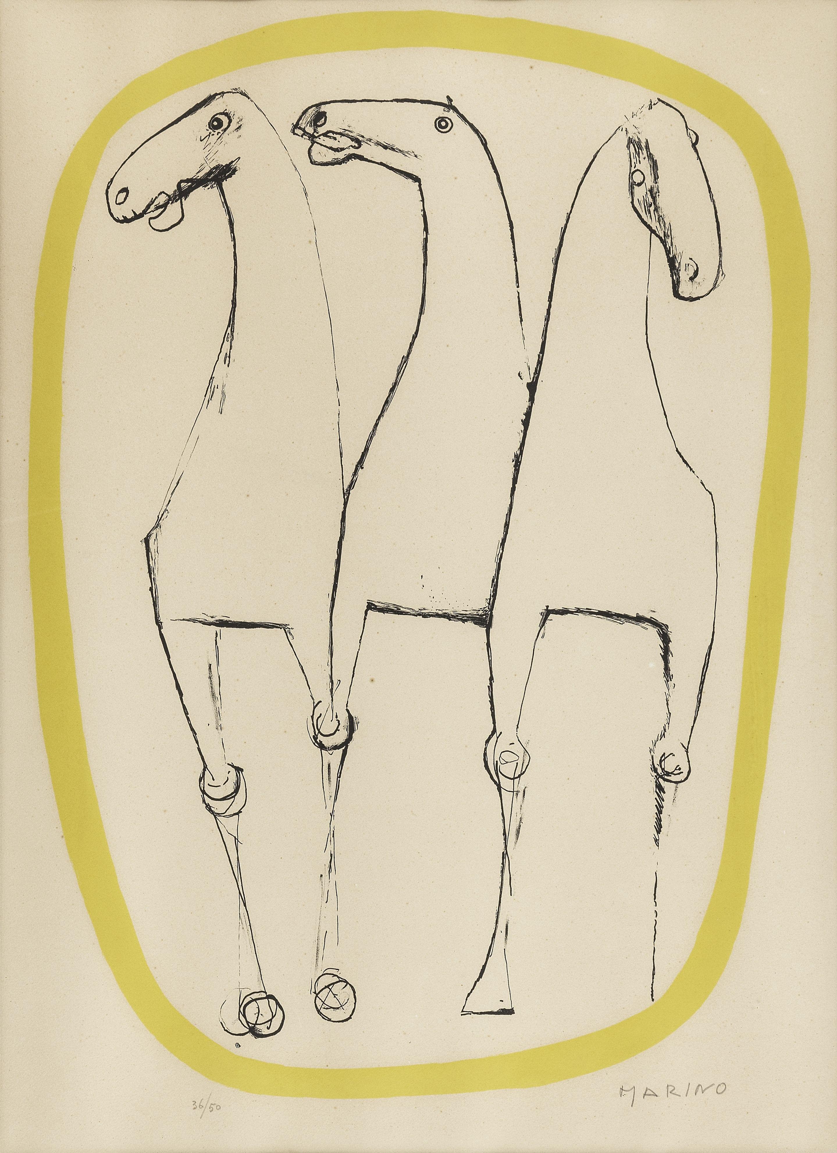 Trois chevaux, estampe en couleur, numérotée 36/50 et signée à la mine de plomb, 63x44 cm