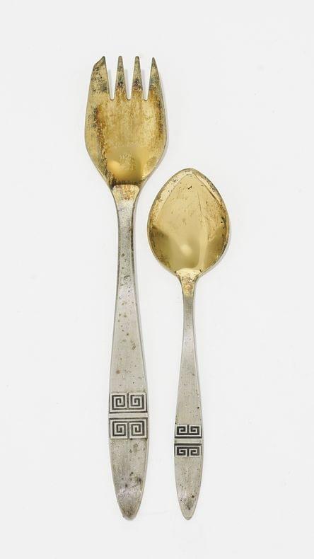 3686. 12 fourchettes à pâtisserie et 12 cuillères à thé à motif de frise grecque