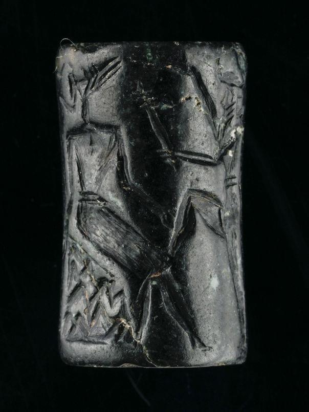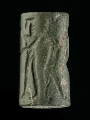 67. Sceau cylindre, schiste vert, Uruk récent, 3300-3000 av. JC