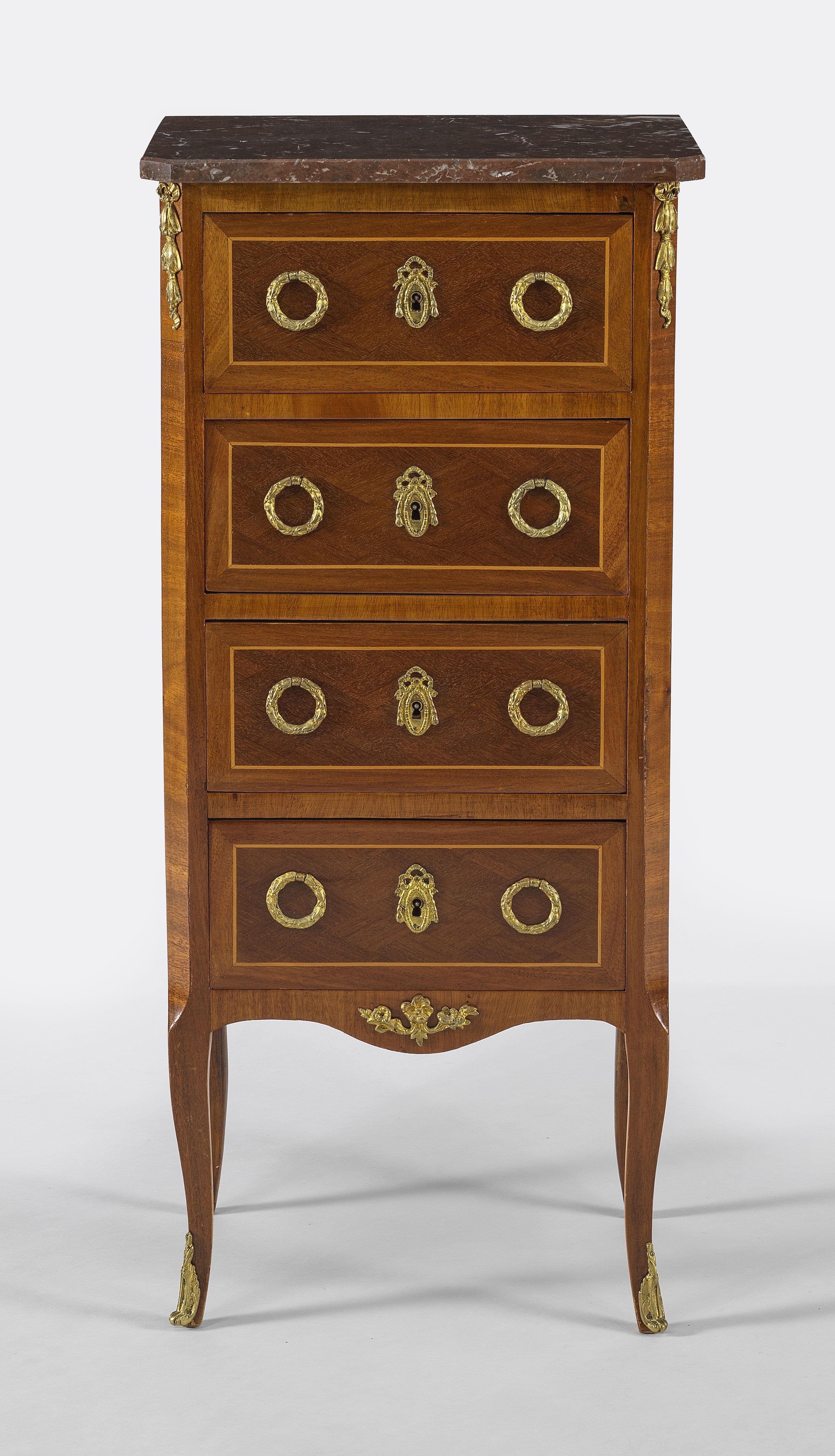 Cinq tiroirs, placage de bois de rose et bois de violette marque...