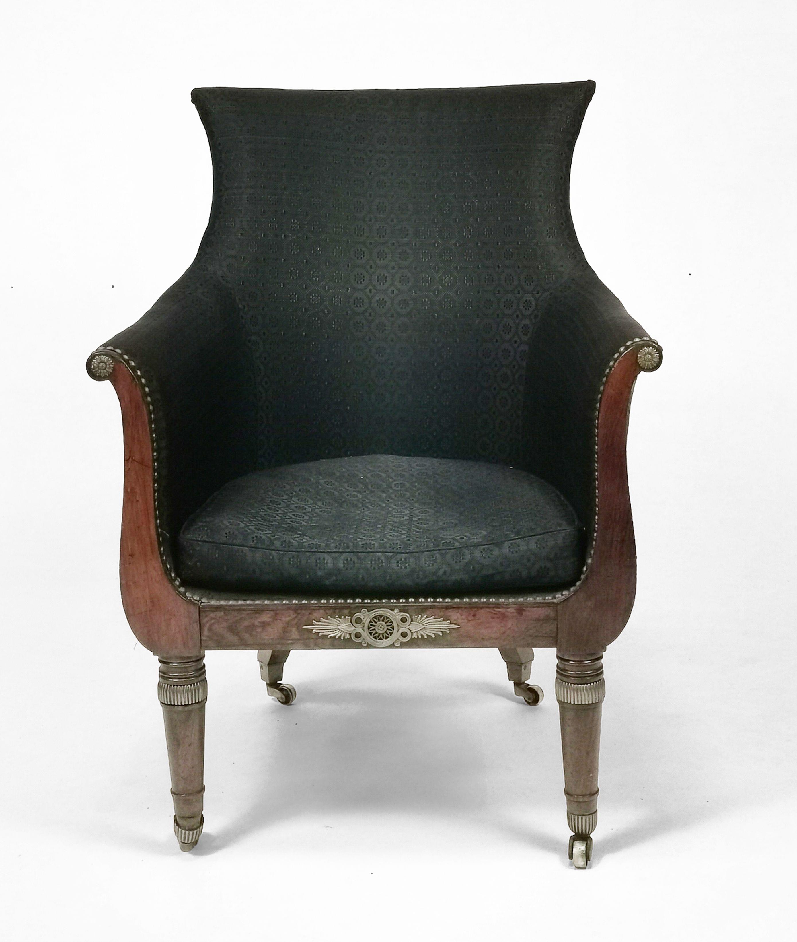 Trois tiroirs, placage de bois de rose, bronzes dorés, cuir noir...