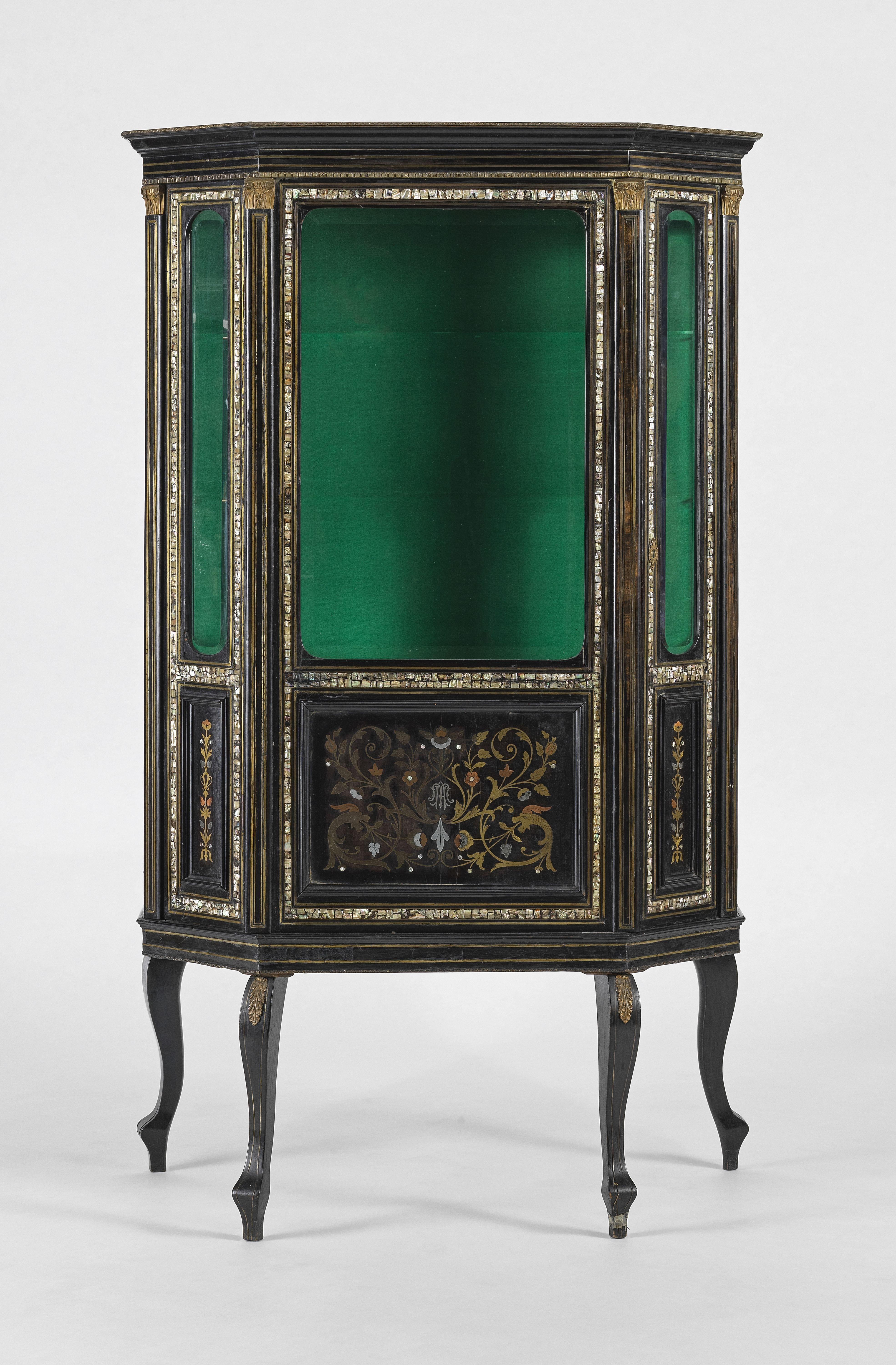 Un vantail vitré, bois noirci à décor marqueté de laiton nacre et étain, motif de rinceaux et monogramme, 169x100x51 cm