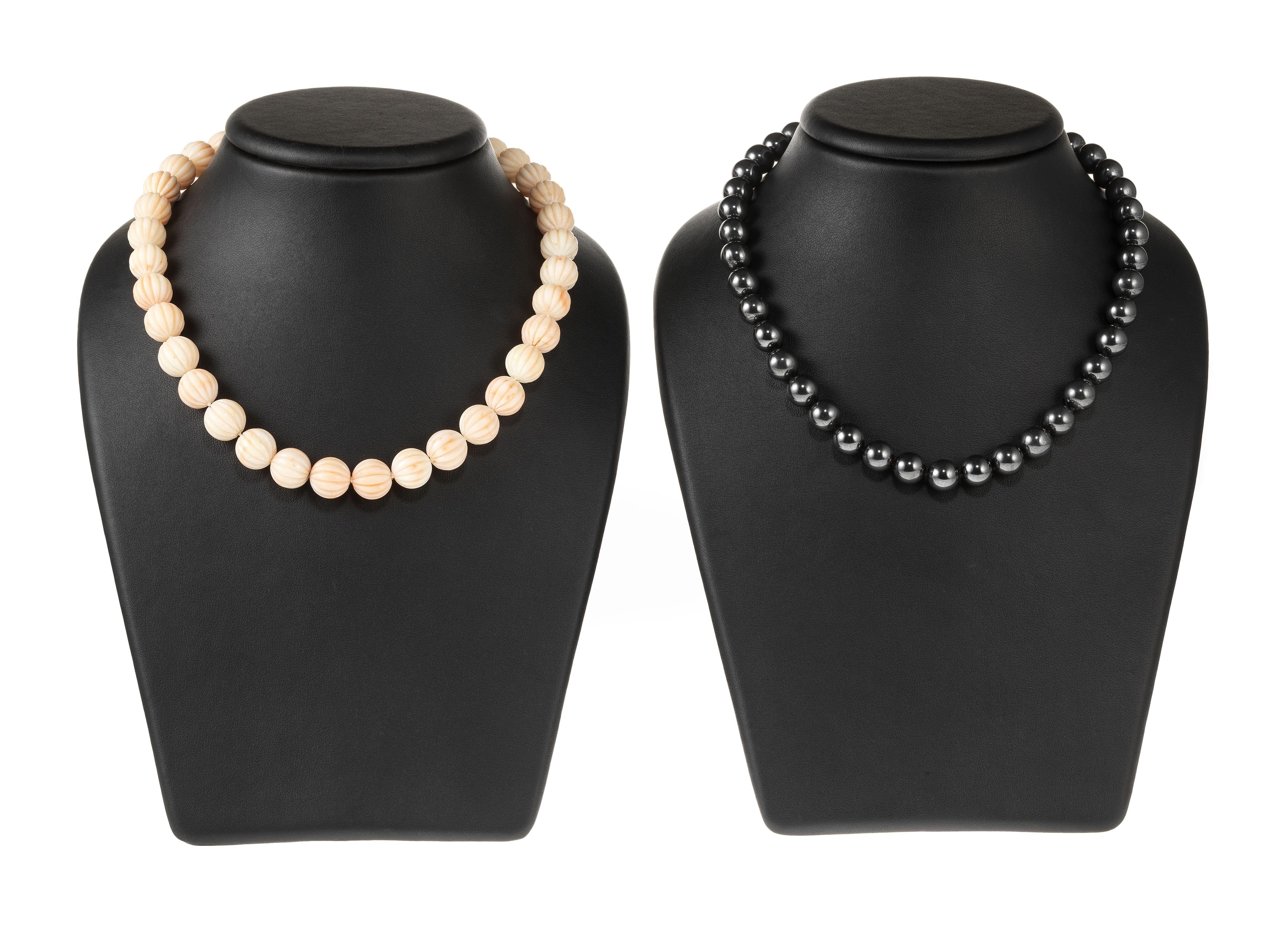 L'un composé de perles de corail peau d'ange sculptées et l'autre de perles d'hématite, fermoirs en or 750, L 42 et 43 cm