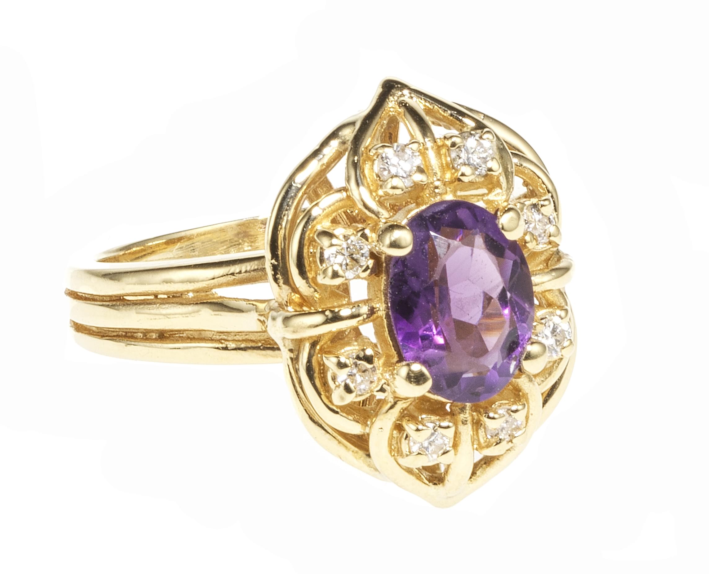 3924. Bague sertie d'une améthyste taille ovale (env. 1 ct) entourée de petits diamants
