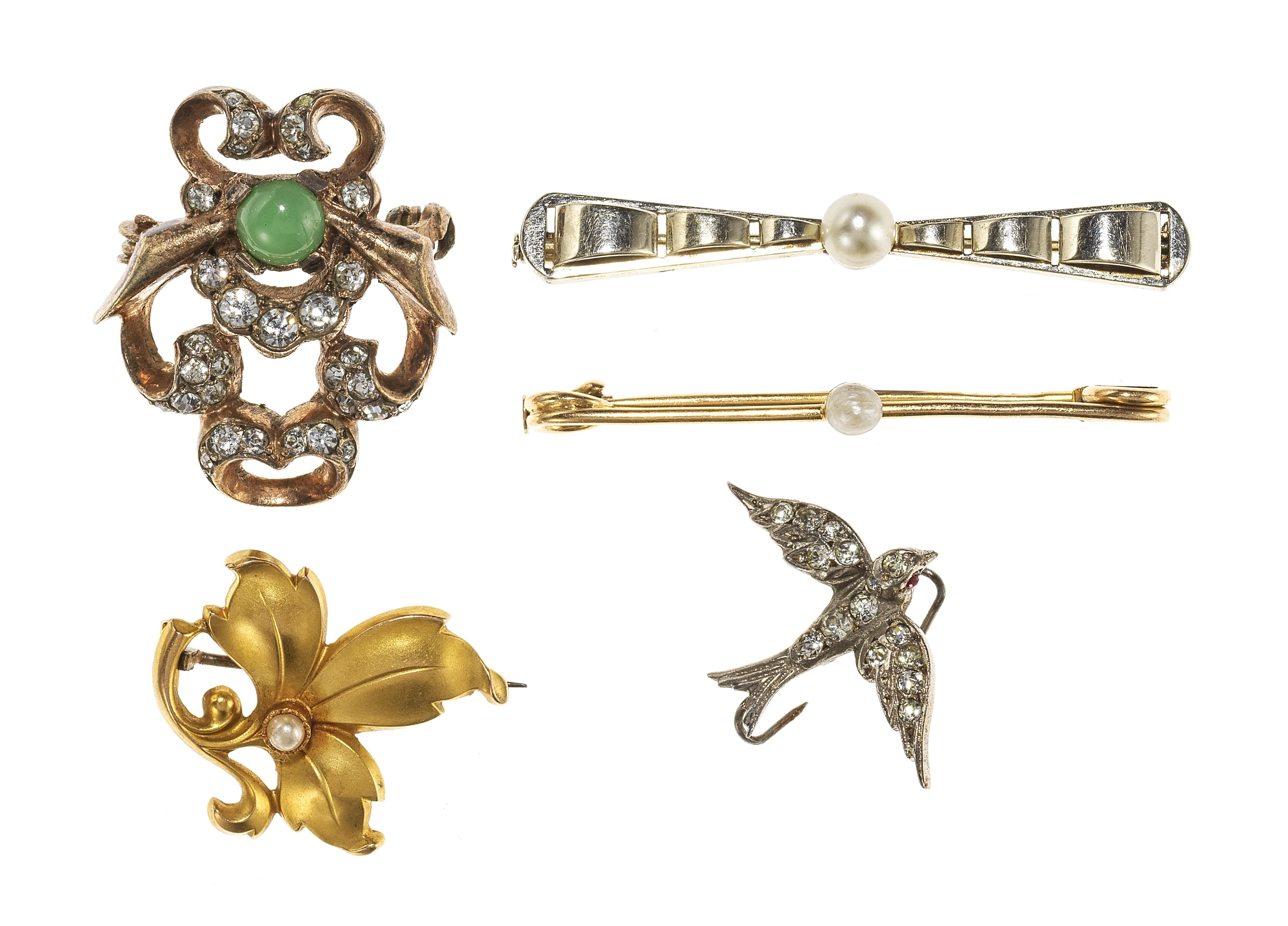Or et or gris 750, L 4 et 4,5 cm, 5 g. On joint une broche oiseau, une broche feuille Art nouveau et une broche en argent sertie de pierres d'imitation pour le diamant, or, argent et métal, H entre 2,5 et 3 cm.