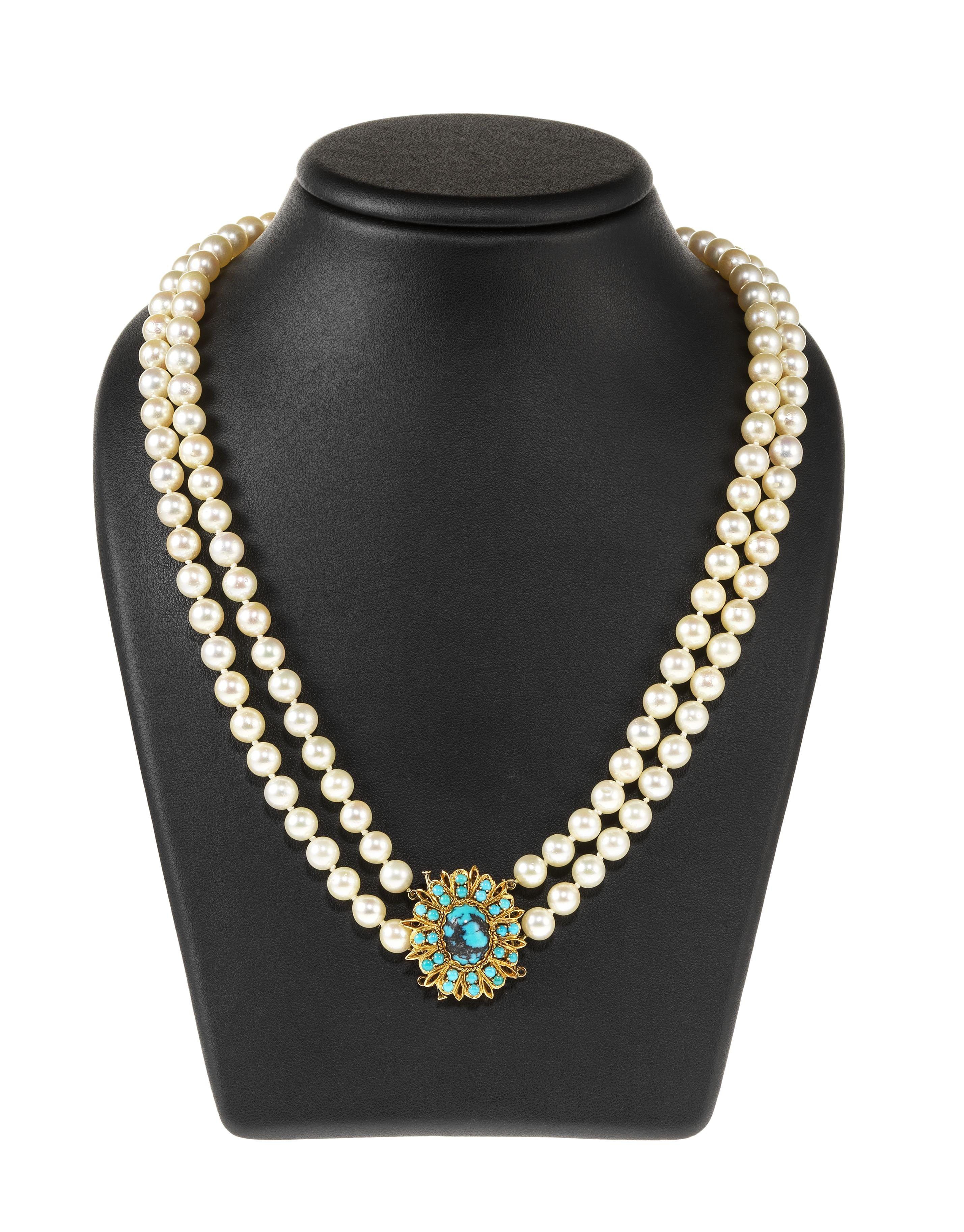 4030. Collier composé de deux rangs de perles (D env. 7,5 mm) terminé par un fermoir serti de turquoises taille cabochon