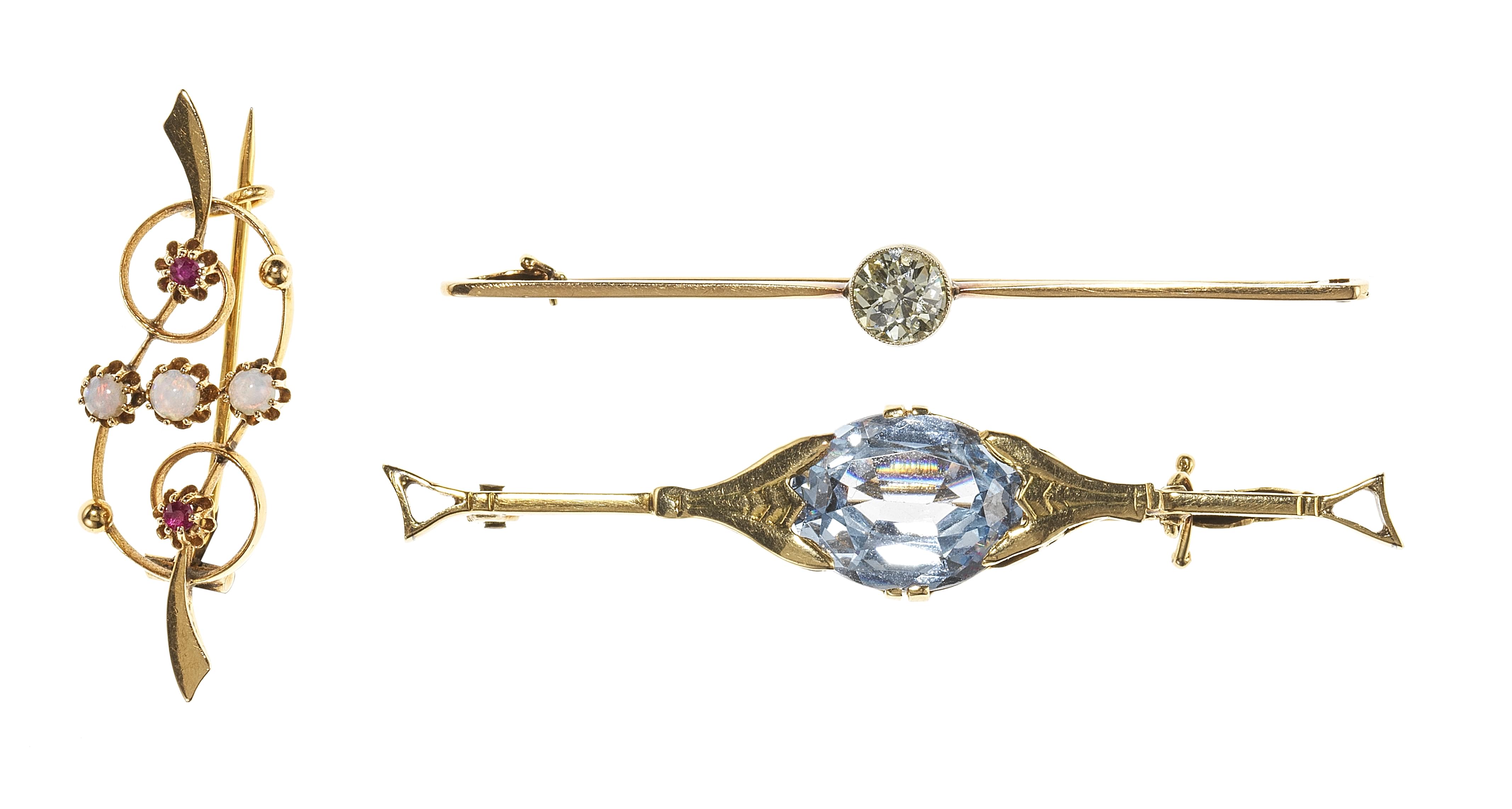 L'une sertie d'un diamant taille ancienne (env. 0,5 ct), l'une pavée d'opales rehaussées de petits rubis et la troisième centrée d'un spinelle synthétique bleu taille ovale, or 585, L entre 3,5 et 5,5 cm, poids brut 8 g
