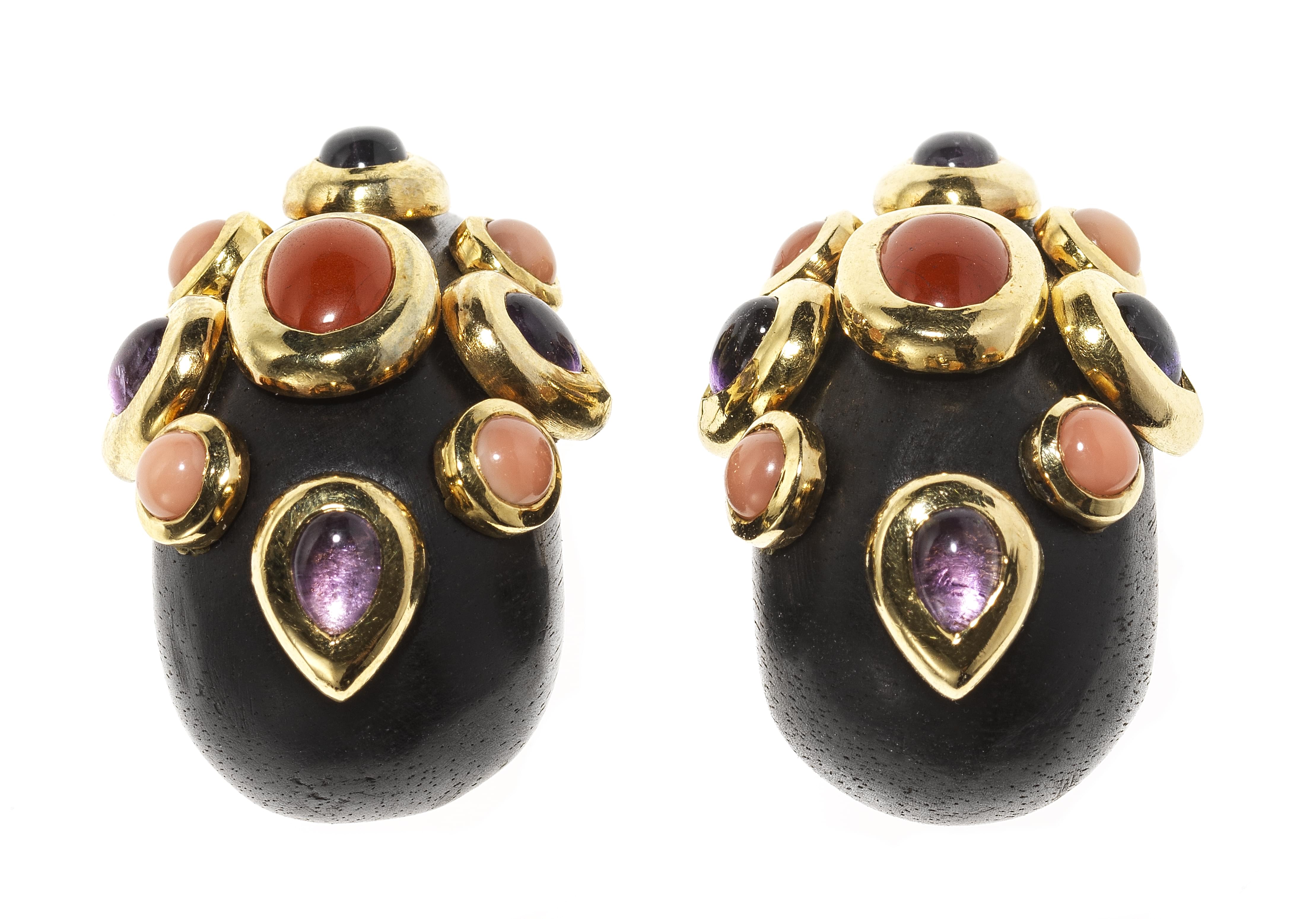 Ponctués de motifs sertis de jaspe rouge, de corail et d'améthystes taille cabochon, ébène et or 750, H 3 cm, poids brut 31 g
