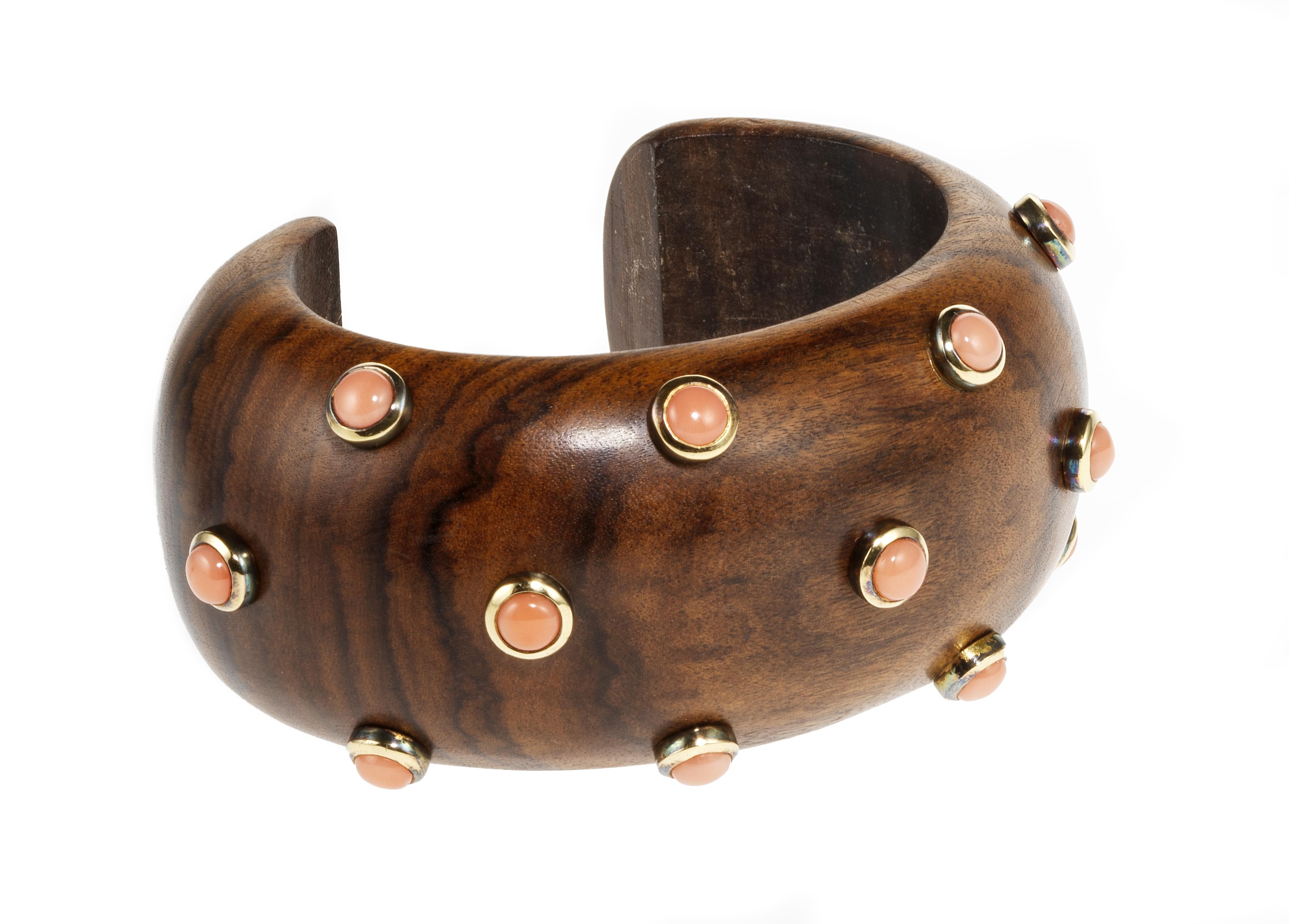 Ponctué de motifs sertis de corail taille cabochon, bois et or 750, D int. 5,5 cm