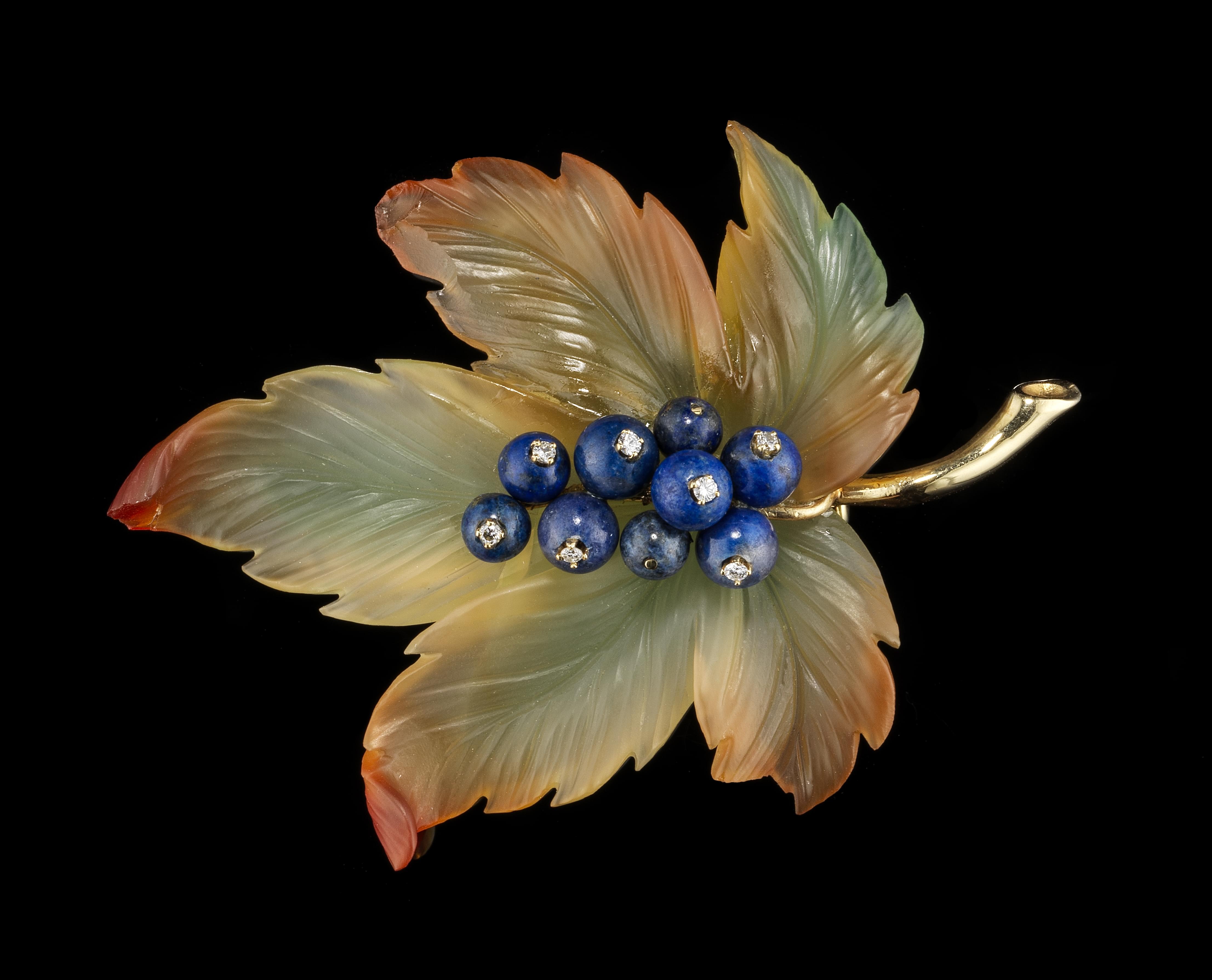 A la feuille en calcédoine et aux raisins en lapis-lazuli sertis de petits diamants, travail autrichien, or 585, L 7 cm, poids brut 23 g