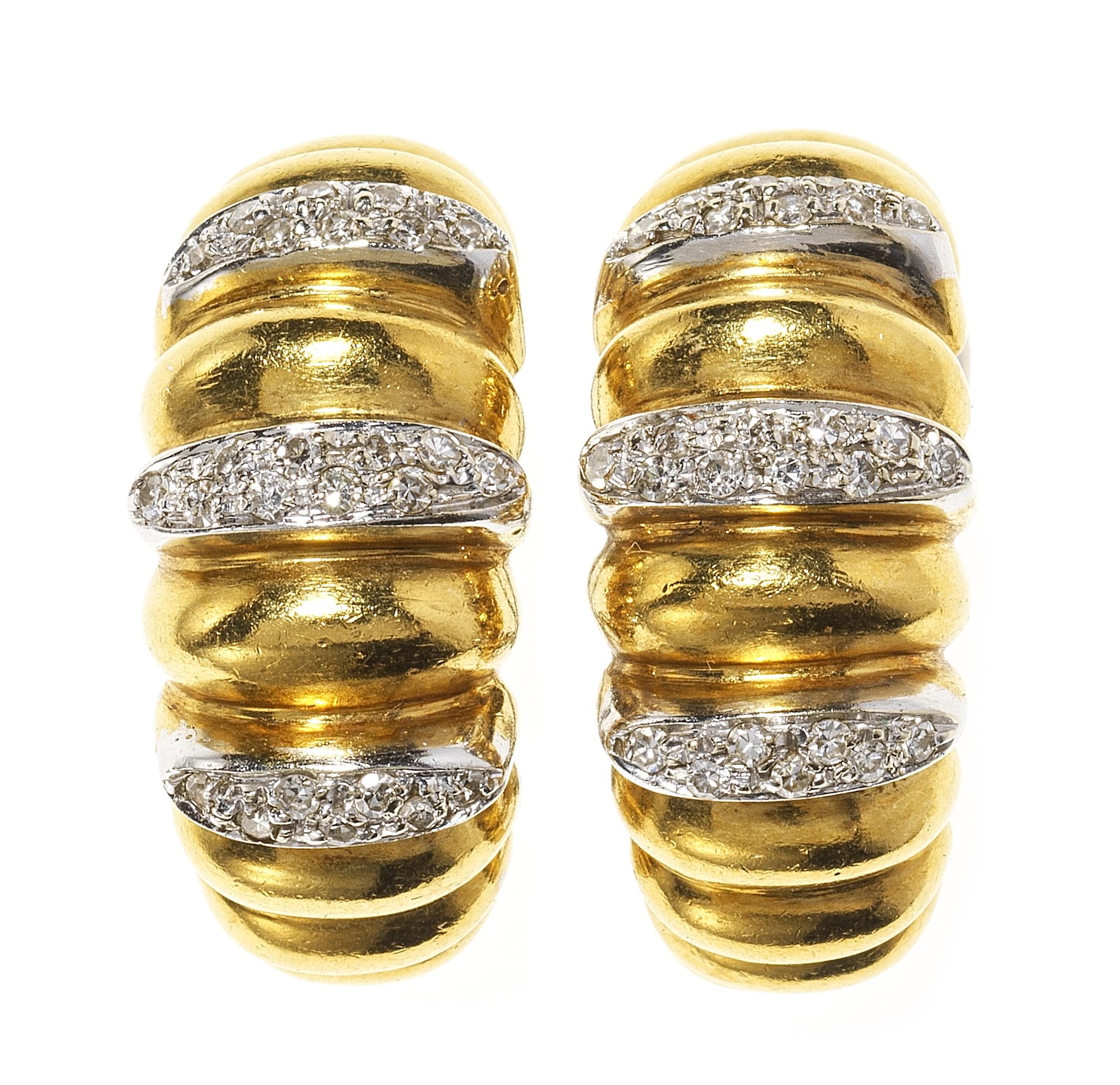 4113. Clips d'oreilles demi-créoles bicolores à motifs godronnés sertis de diamants