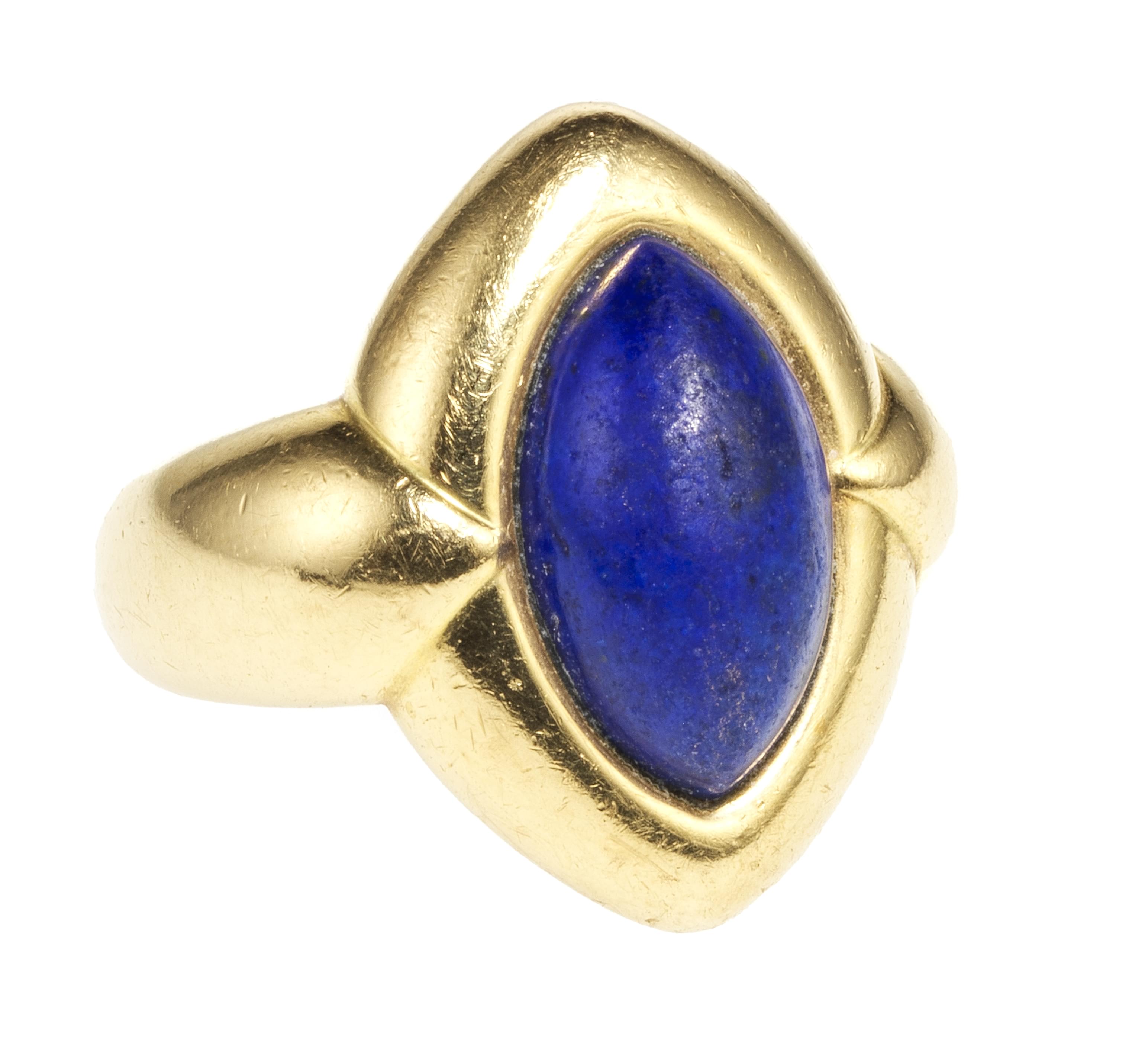 4121. Bague stylisée sertie d'un lapis lazulis taille cabochon navette