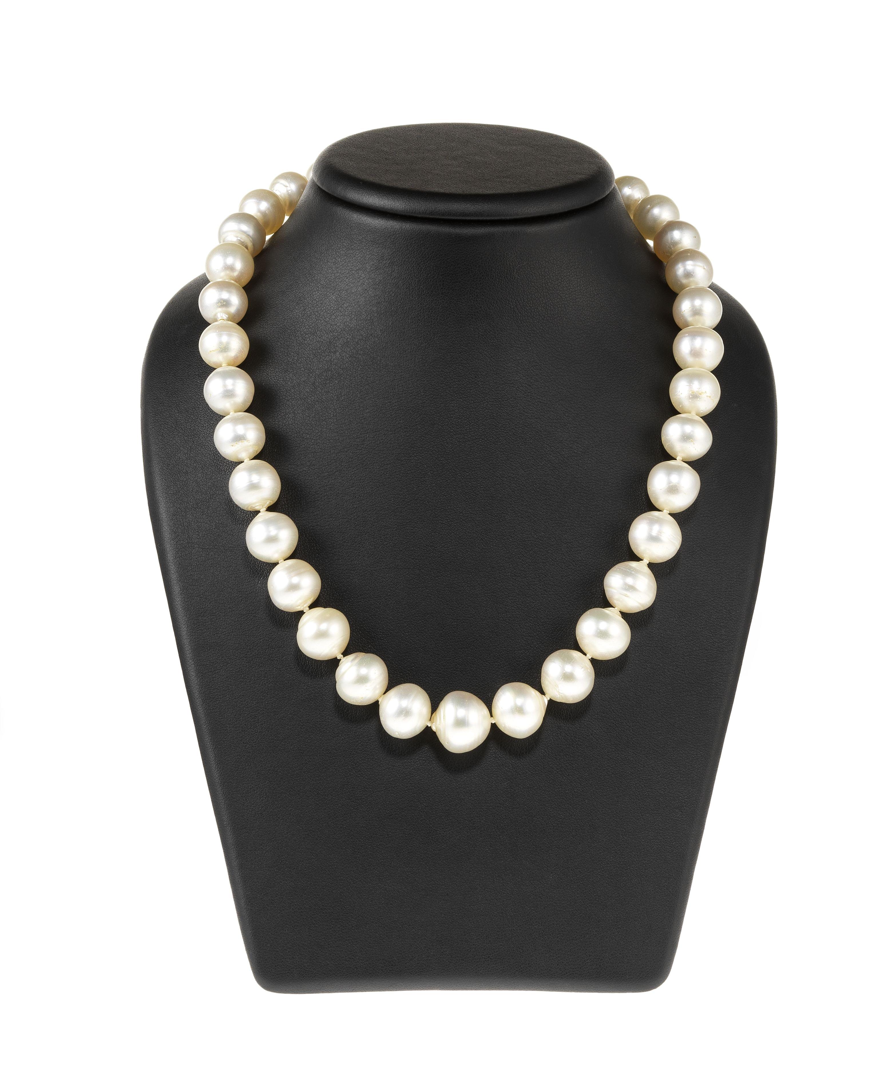 4125. Collier de perles baroques des Mers du sud en légère chute (D env. entre 12,5 et 15,5 mm) terminé par un fermoir boule pavé de diamants