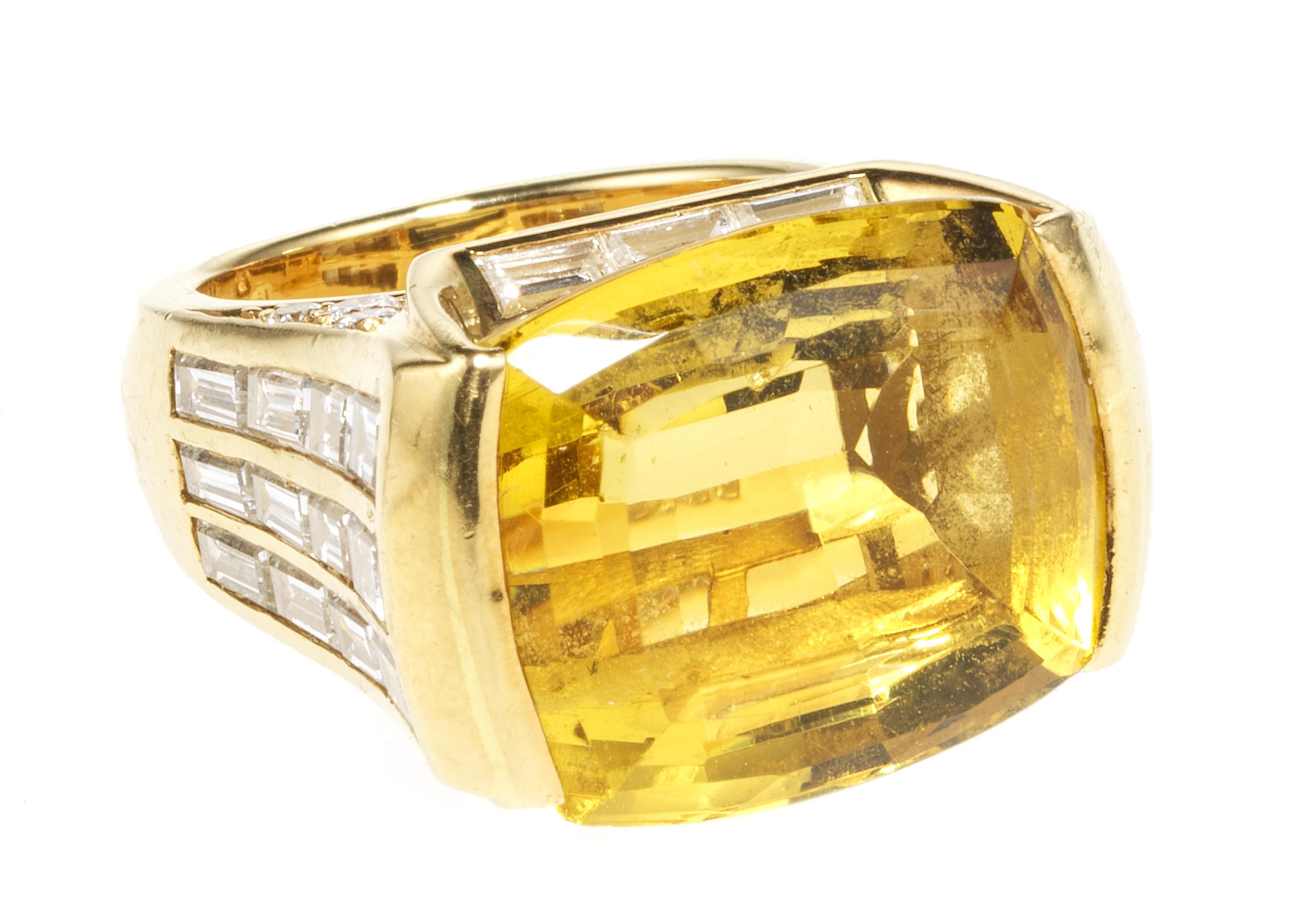 4146. Bague centrée probablement d'une orthose taille ovale épaulée de diamants taille baguette et brillant