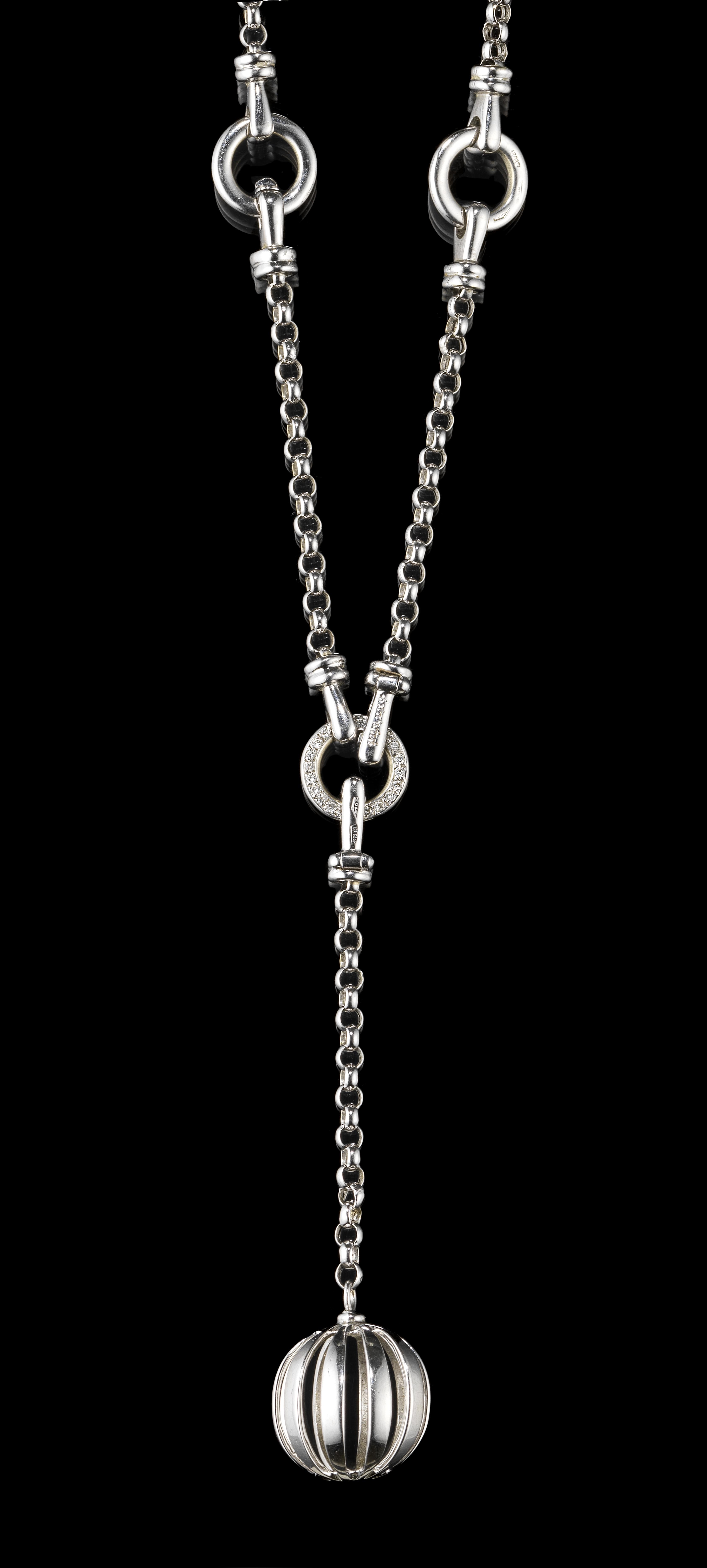 4177. Antonini, collier à maille forçat retenant un motif de boule ajourée rehaussée de motifs ronds, l'un serti de petits diamants