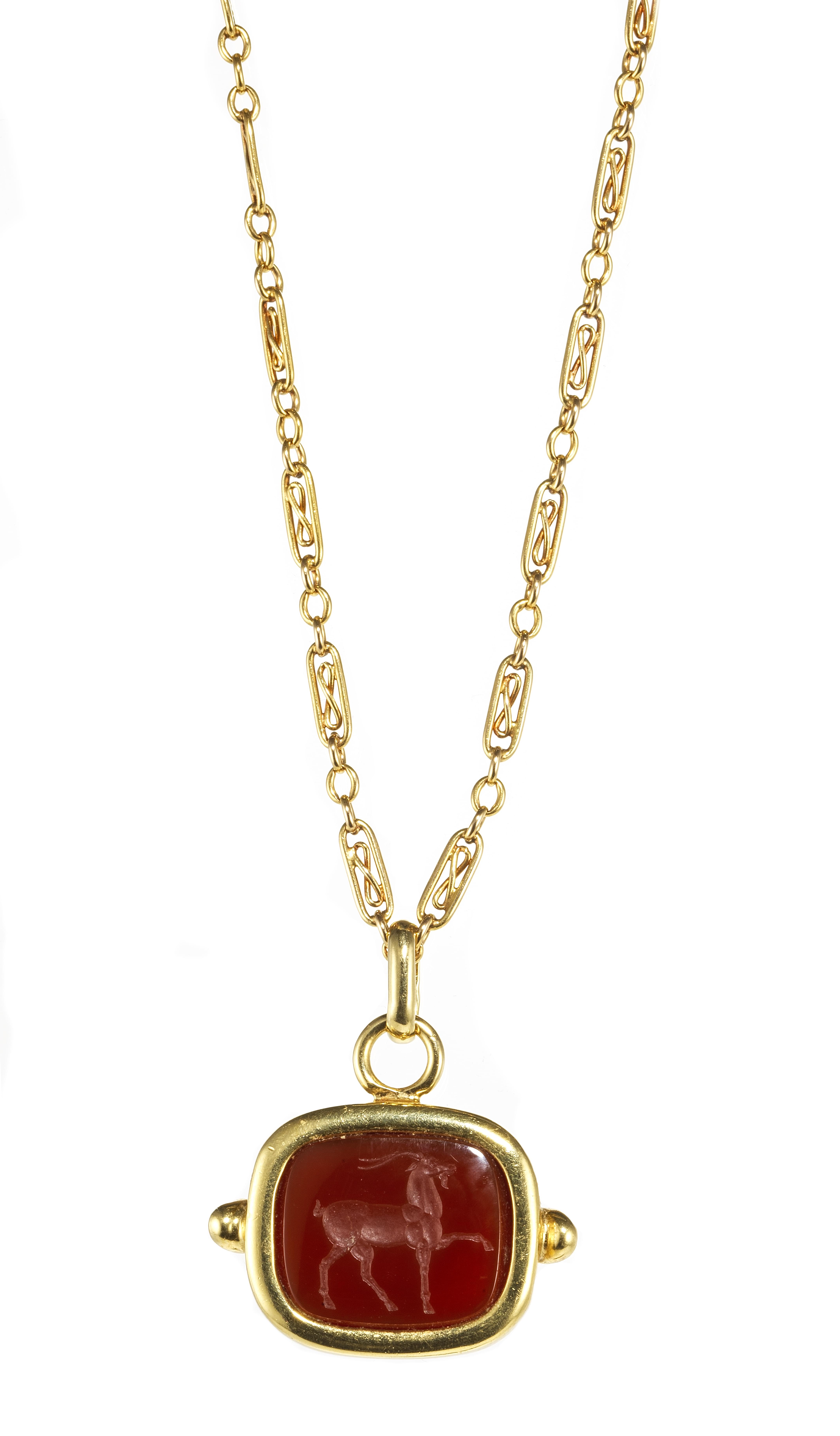 4183. Médaille sertie d'une intaille sur cornaline à motif d'antilope, retenue par une chaîne à maille fantaisie