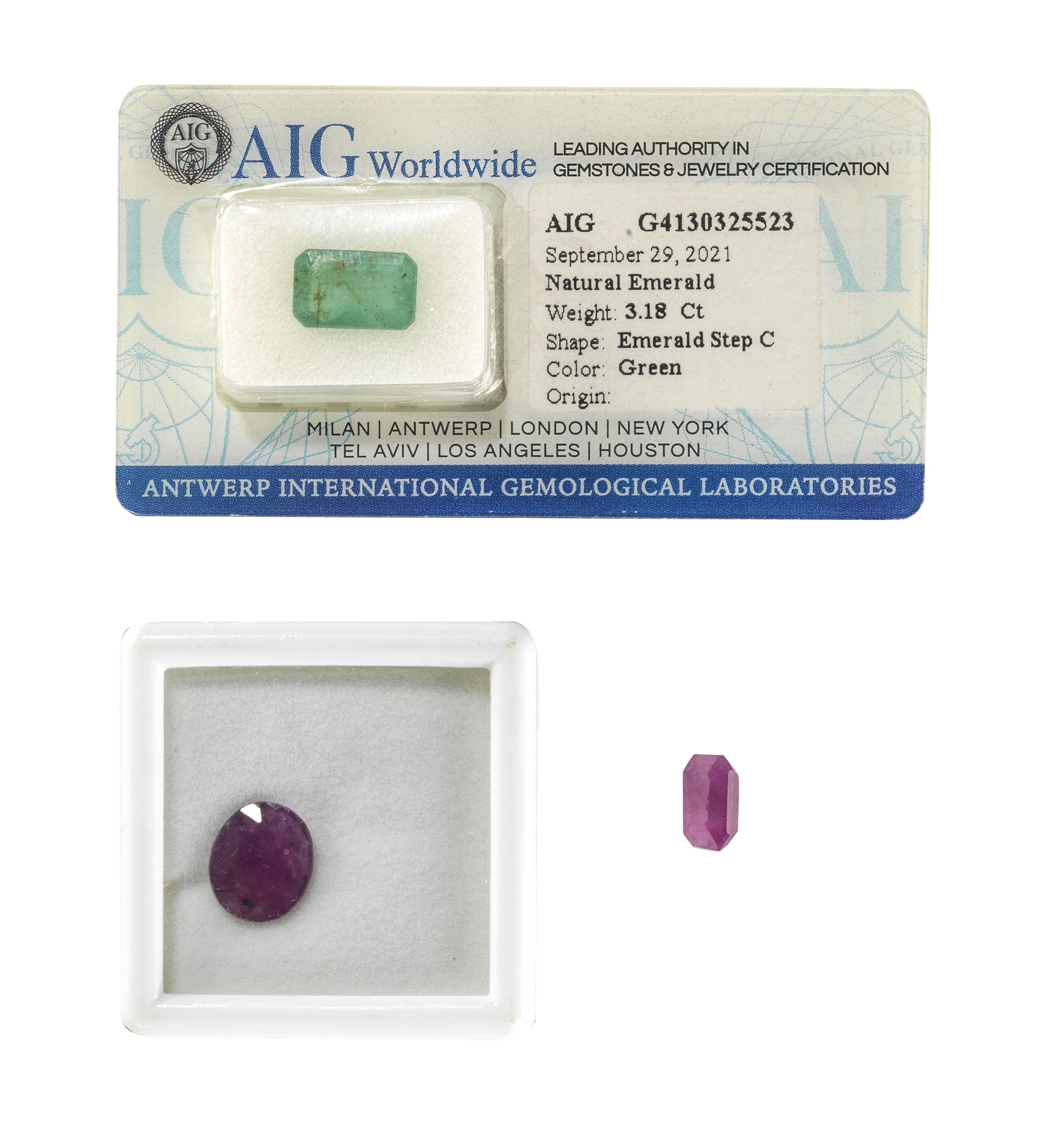Un rubis taille ovale 3,44 ct, un rubis taille émeraude non chauffé 2,64 ct et une émeraude taille émeraude moderate oil 3,18 ct. Pour les lots précédés d'un *, la TVA de 7,7% est due sur l'entier du prix d'adjudication.