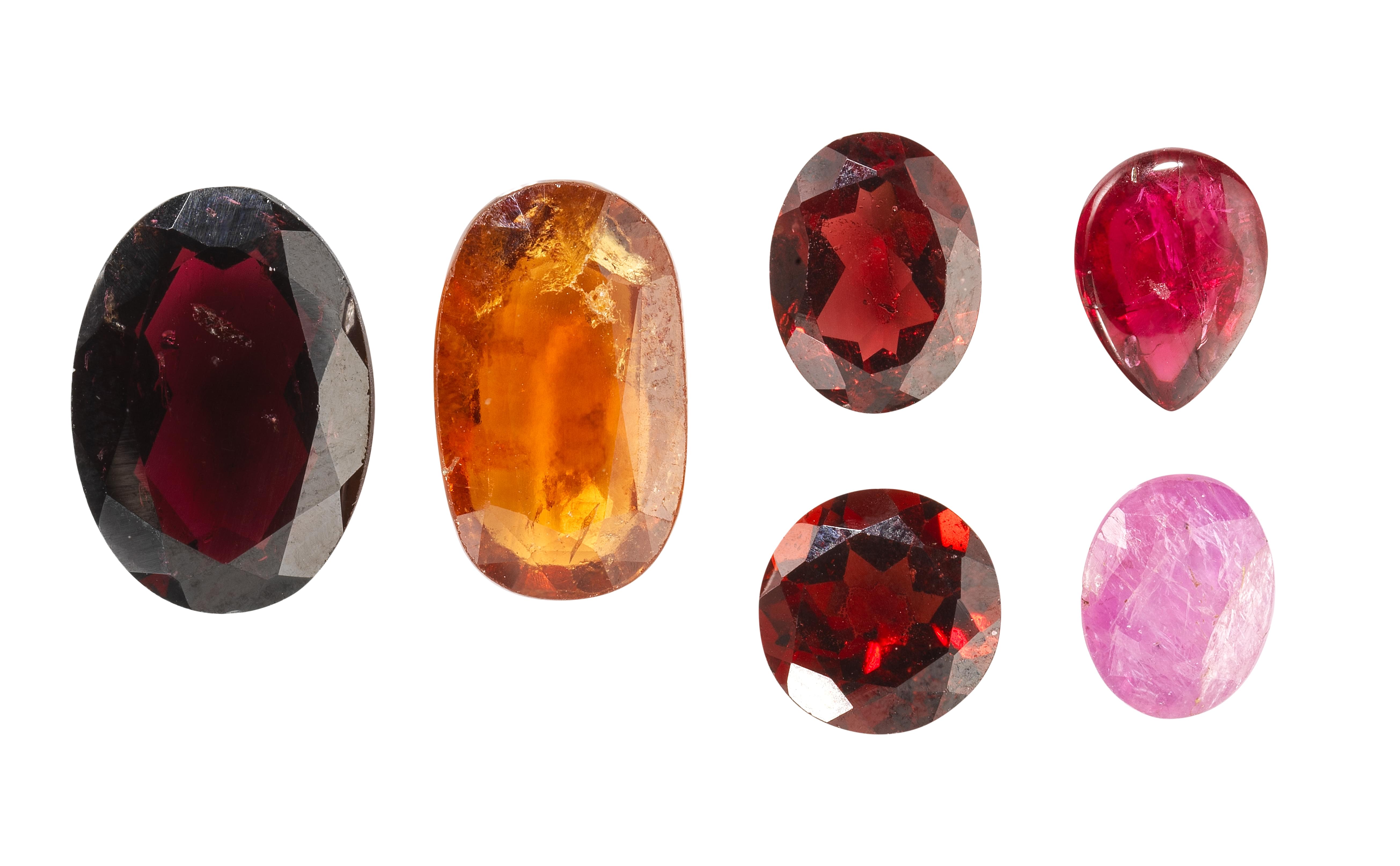 Un rubis non chauffé taille ovale (1,77 ct), un spinel taille cabochon poire (1,67 ct), une rhodolite taille ovale (5,87 ct), deux grenats pyrope-rhodolite taille brillant (2,59 ct) et taille ovale (2,45 ct), une hessonite taille ovale (3,61 ct). Pour les lots précédés d'un *, la TVA de 7,7% est due sur l'entier du prix d'adjudication.
