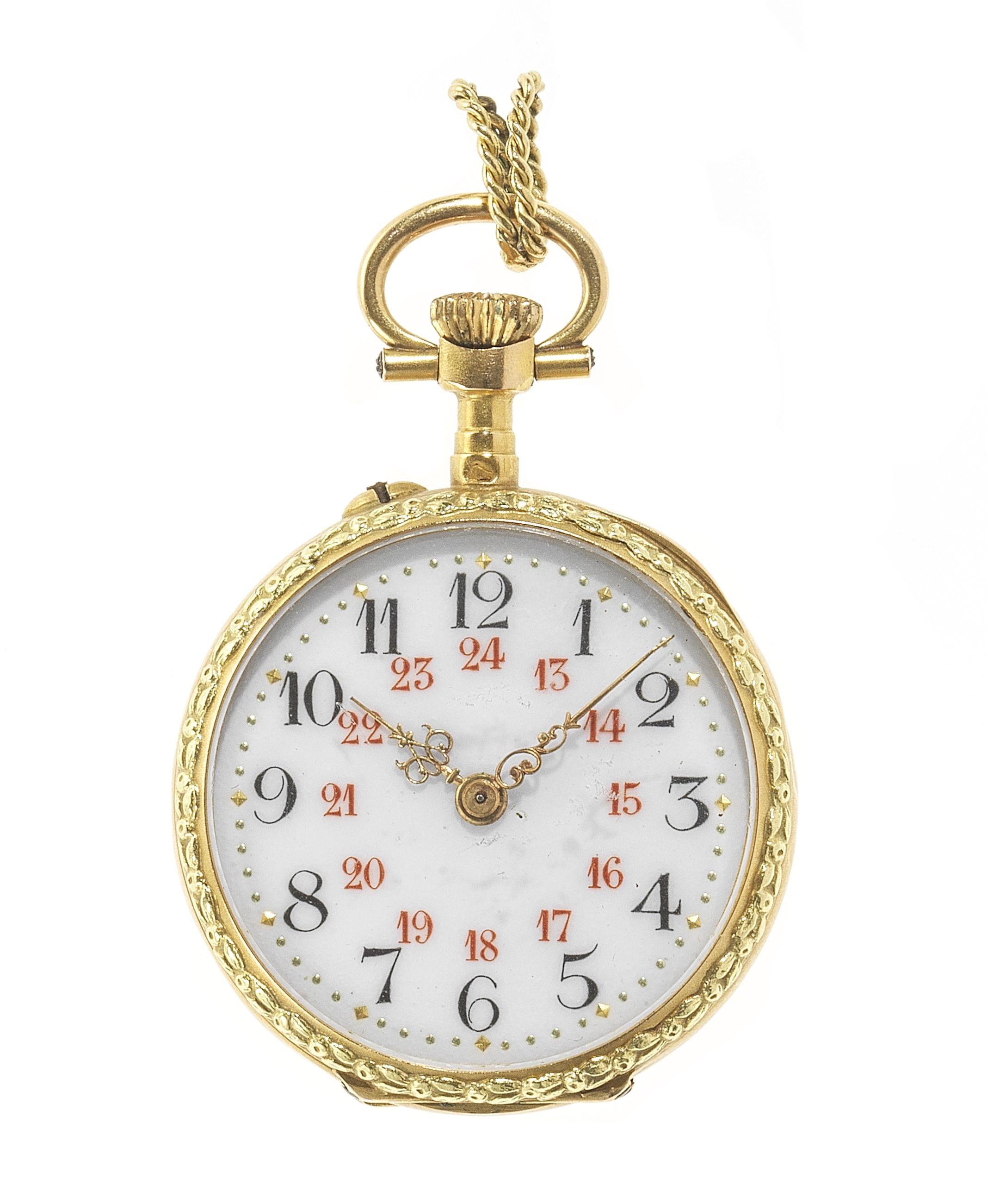 Cadran émaillé blanc, aiguilles dorées, chiffres arabes noirs et rouges, travail français fin XIXe s, or 750, D 27 mm, poids brut 16 g