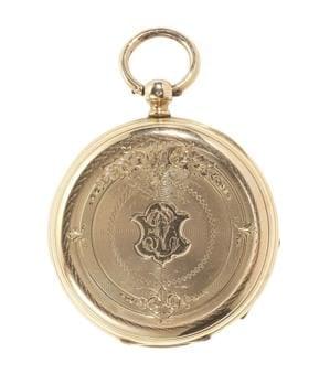 Cadran blanc émaillé, aiguilles anciennement dorées, chiffres romains noirs, secondes à 6h, travail français, or 750, D 43 mm, poids brut 51 g
