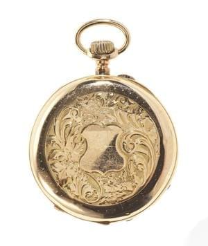Cadran émaillé blanc, aiguilles dorées, chiffres romains noirs, secondes à 6h, travail français, or 750, D 40 mm, poids brut 51 g