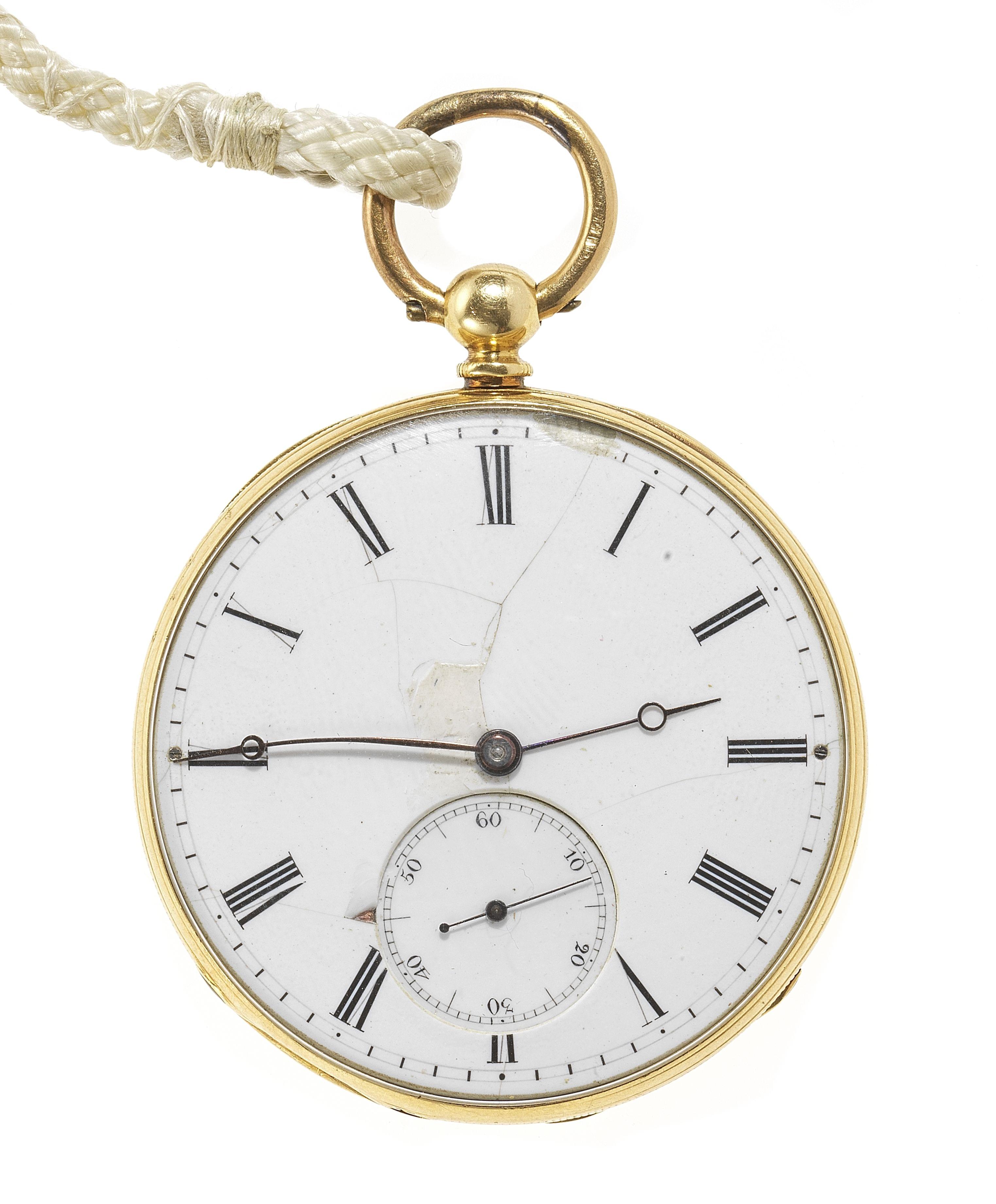 Cadran émaillé, aiguilles et chiffres romains noirs, secondes à 6h, or 750, D 44 mm, poids brut 56 g