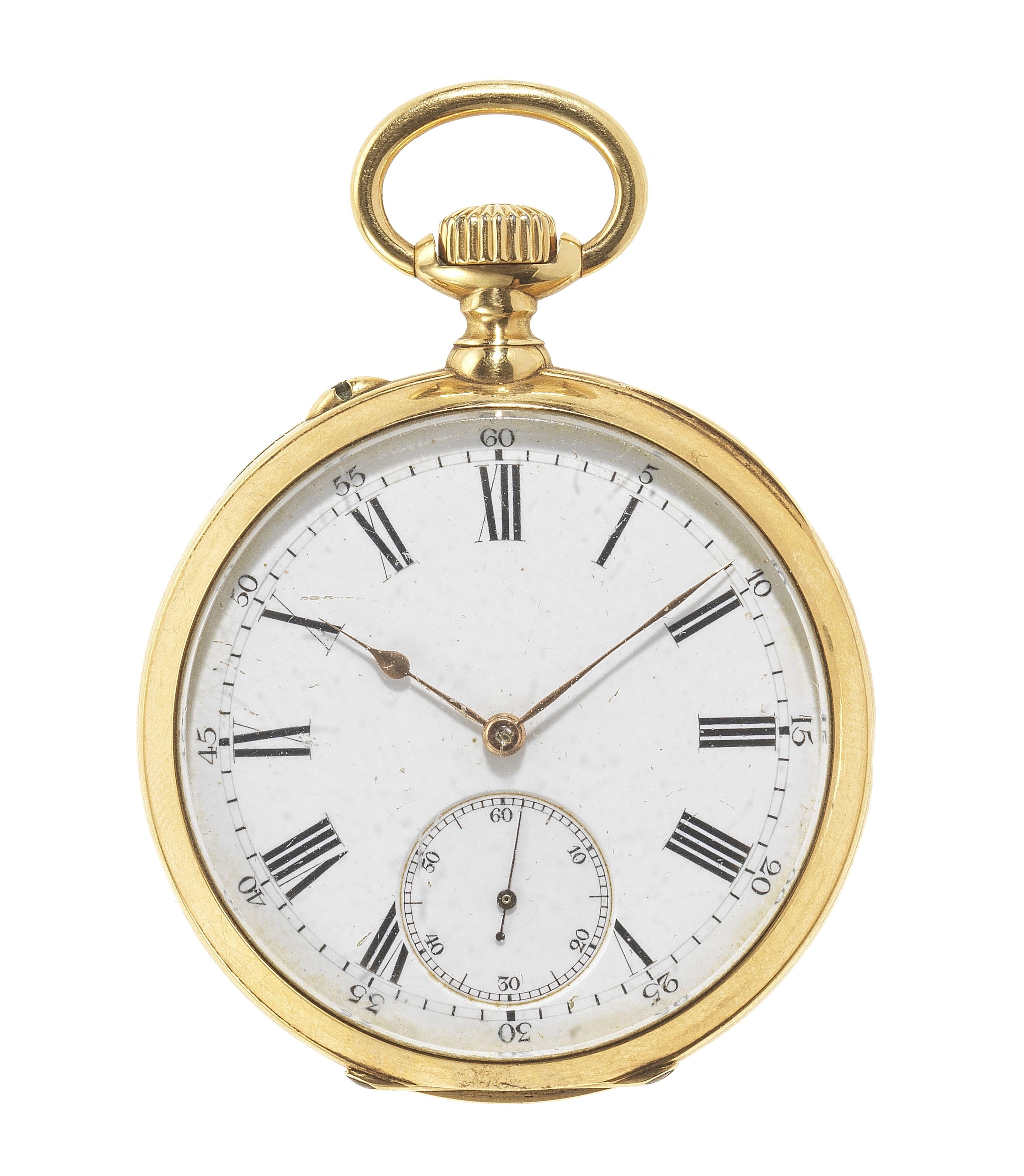 Cadran émaillé blanc, aiguilles dorées, chiffres romains noirs, secondes à 6h, or 750, D 46 mm, poids brut 79 g