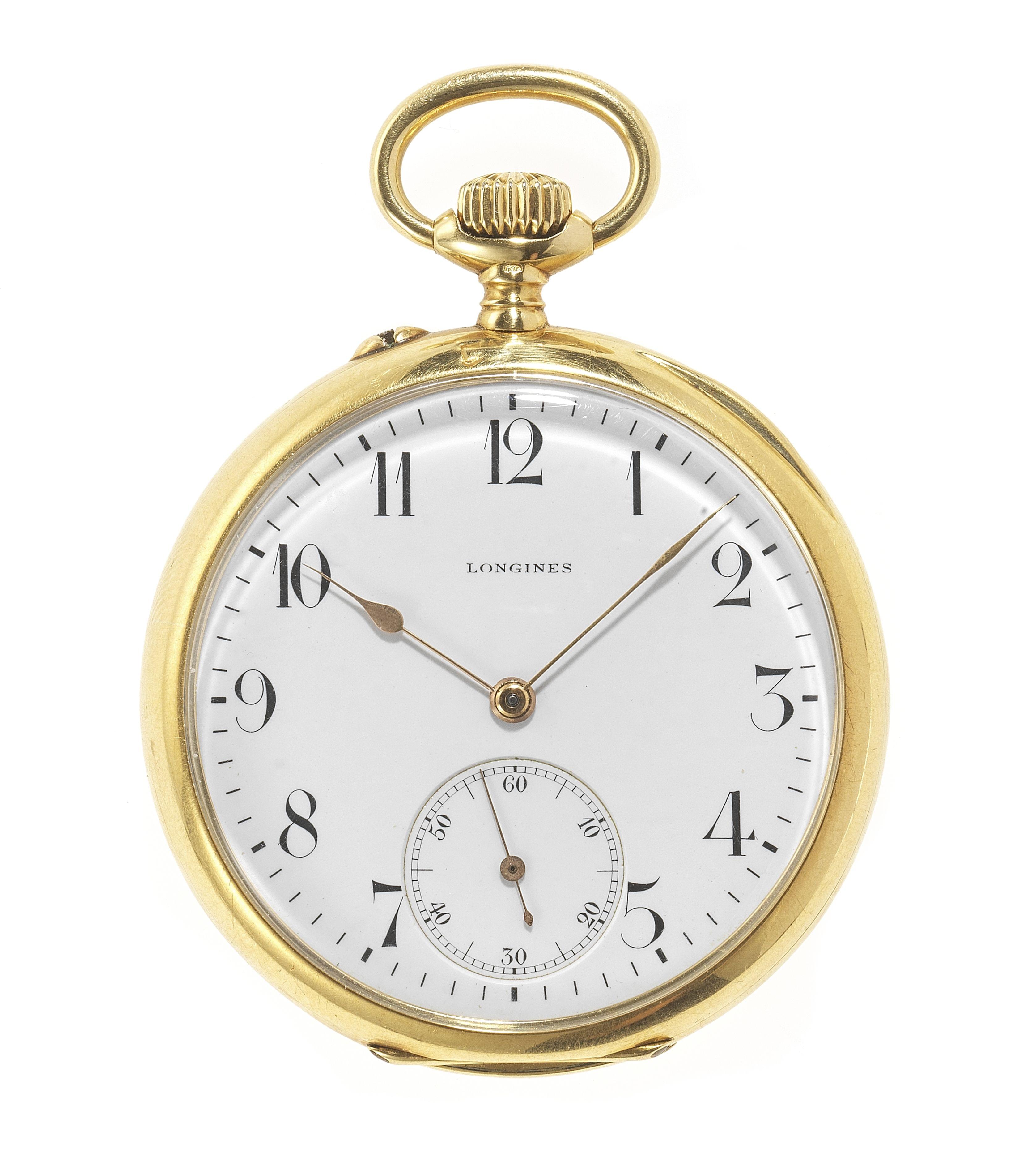 Cadran émaillé blanc, aiguilles dorées, chiffres arabes noirs, secondes à 6h, or 750, D 47 mm, poids brut 79 g