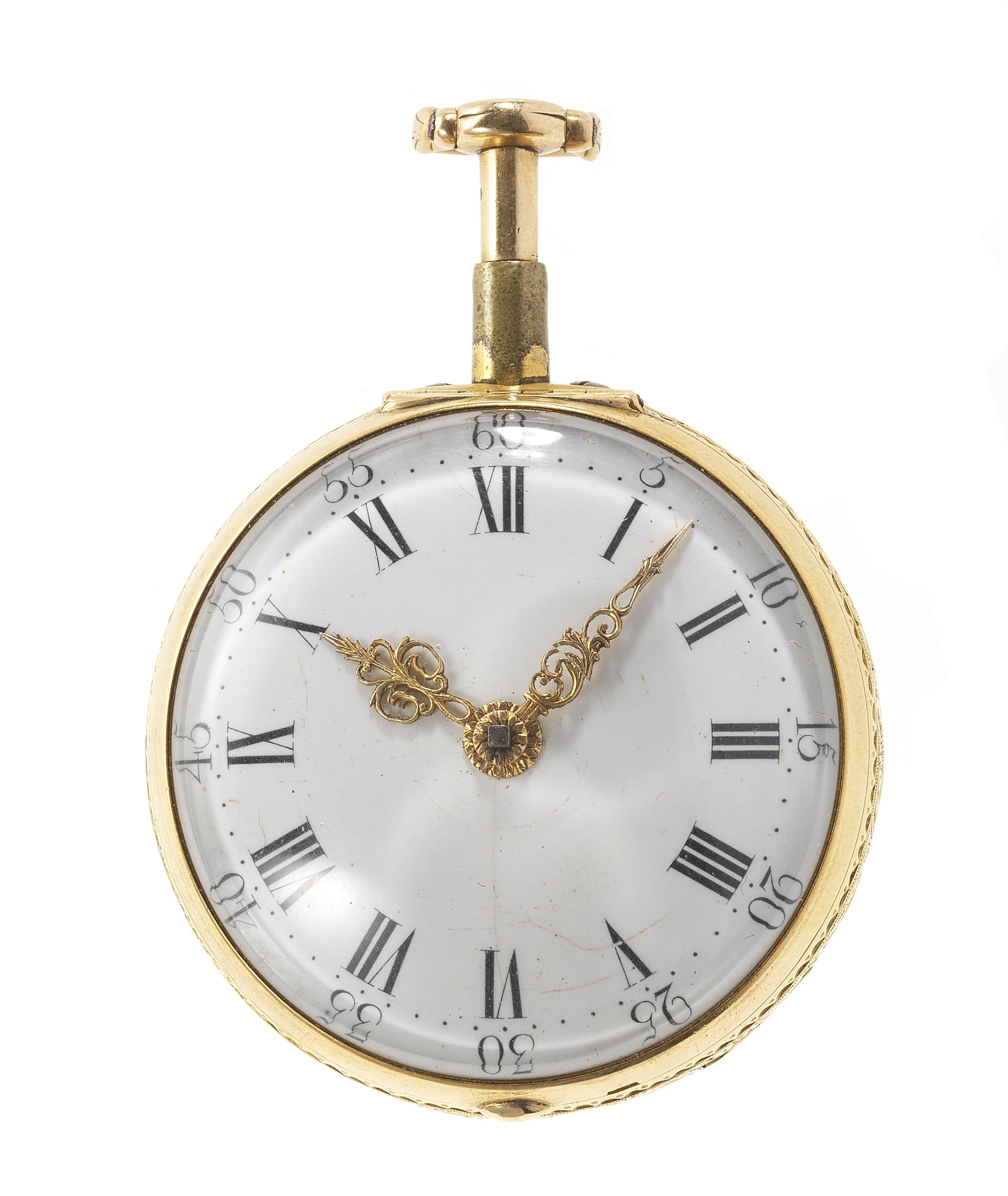 Cadran émaillé blanc, aiguilles dorées, chiffres romains noirs, vers 1780, numéroté 459, or 750, D 45 cm, poids brut 117 g, avec son double boîtier et sa clé en laiton doré