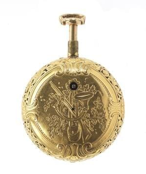 4298. Jn Bourquin, London, montre de poche oignon ouvragée à sonnerie et décor de trophée de chasse