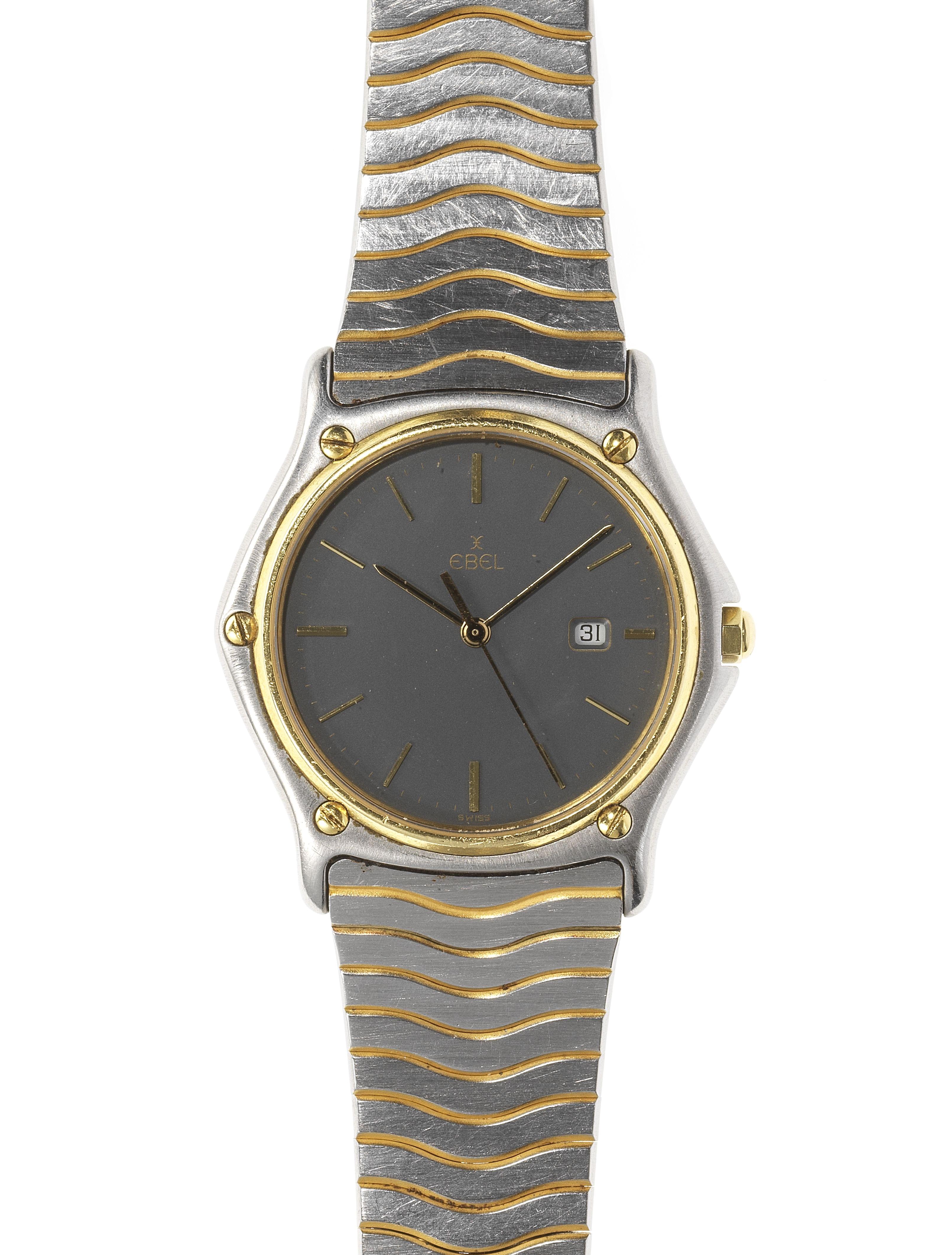 Cadran anthracite, aiguilles et index bâtons dorés, date à guichet à 3h, acier et acier doré, D 33 mm, L 18 cm