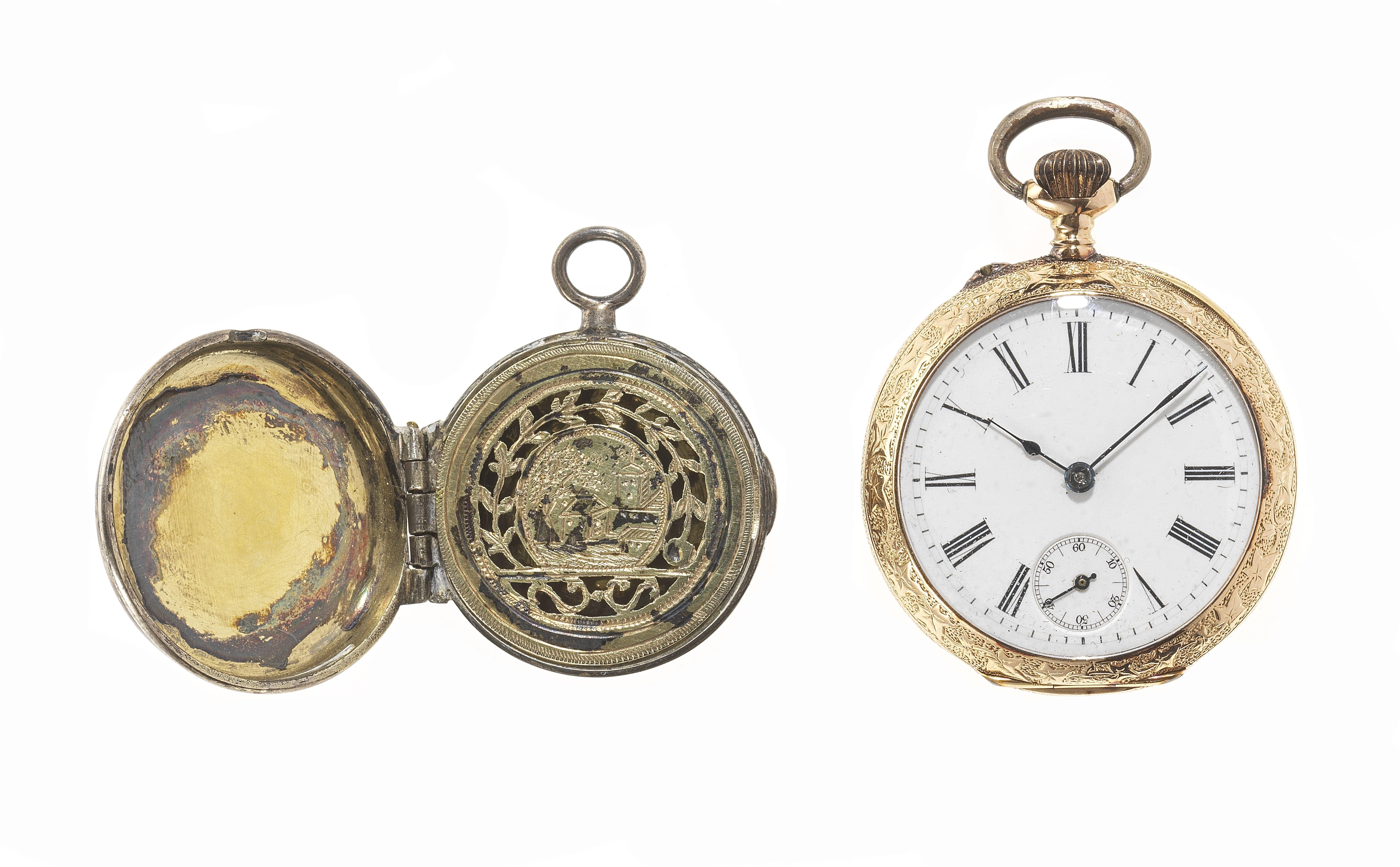Cadran émaillé blanc, aiguilles bleues, chiffres romains noirs, secondes à 6h, Circa 1898, or 585, D 33 mm, poids brut 30 g. On joint un médaillon en argent, D 2,5 cm.