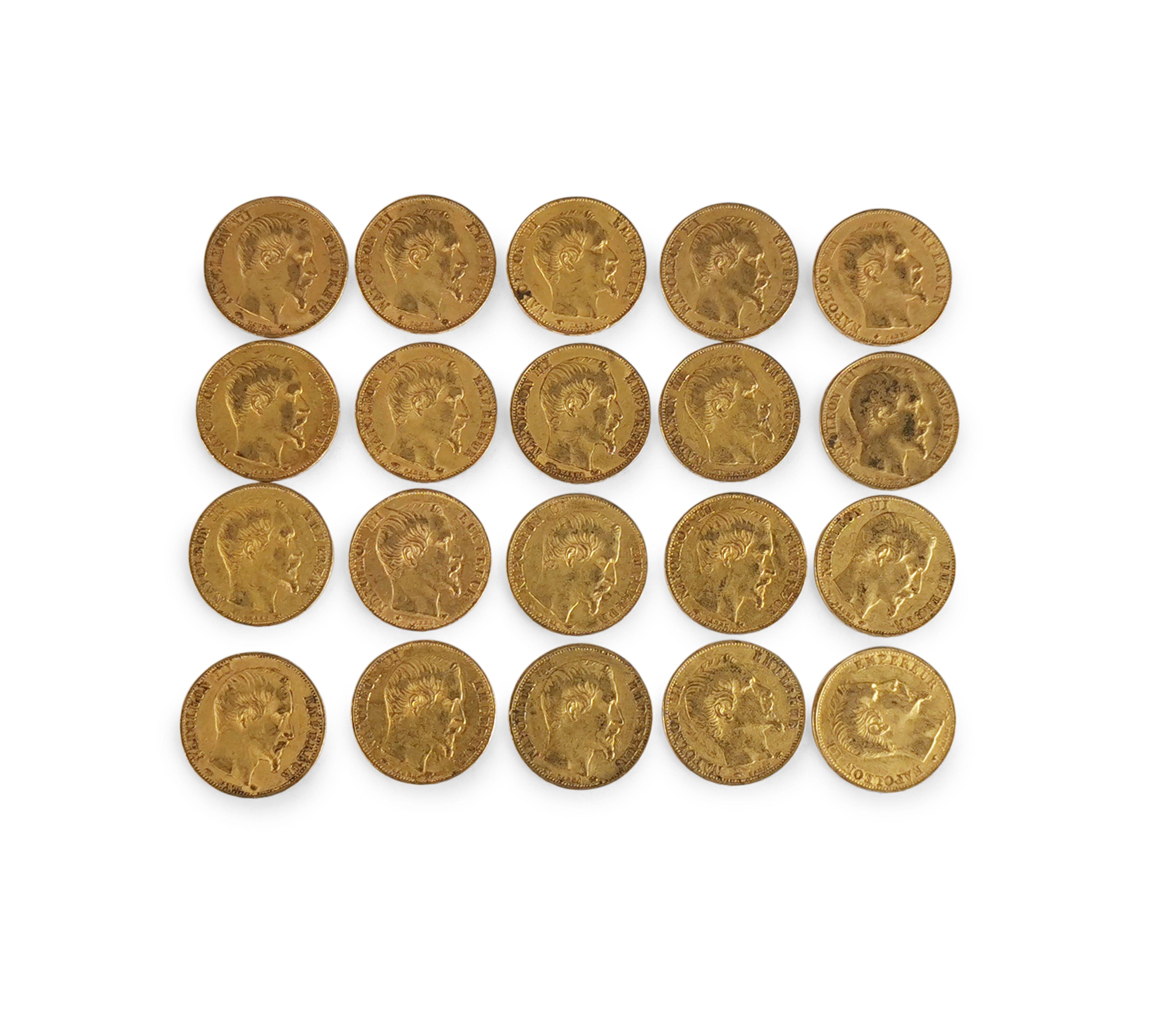 4362. Lot de vingt pièces de 20 francs Napoléon III (tête nue)