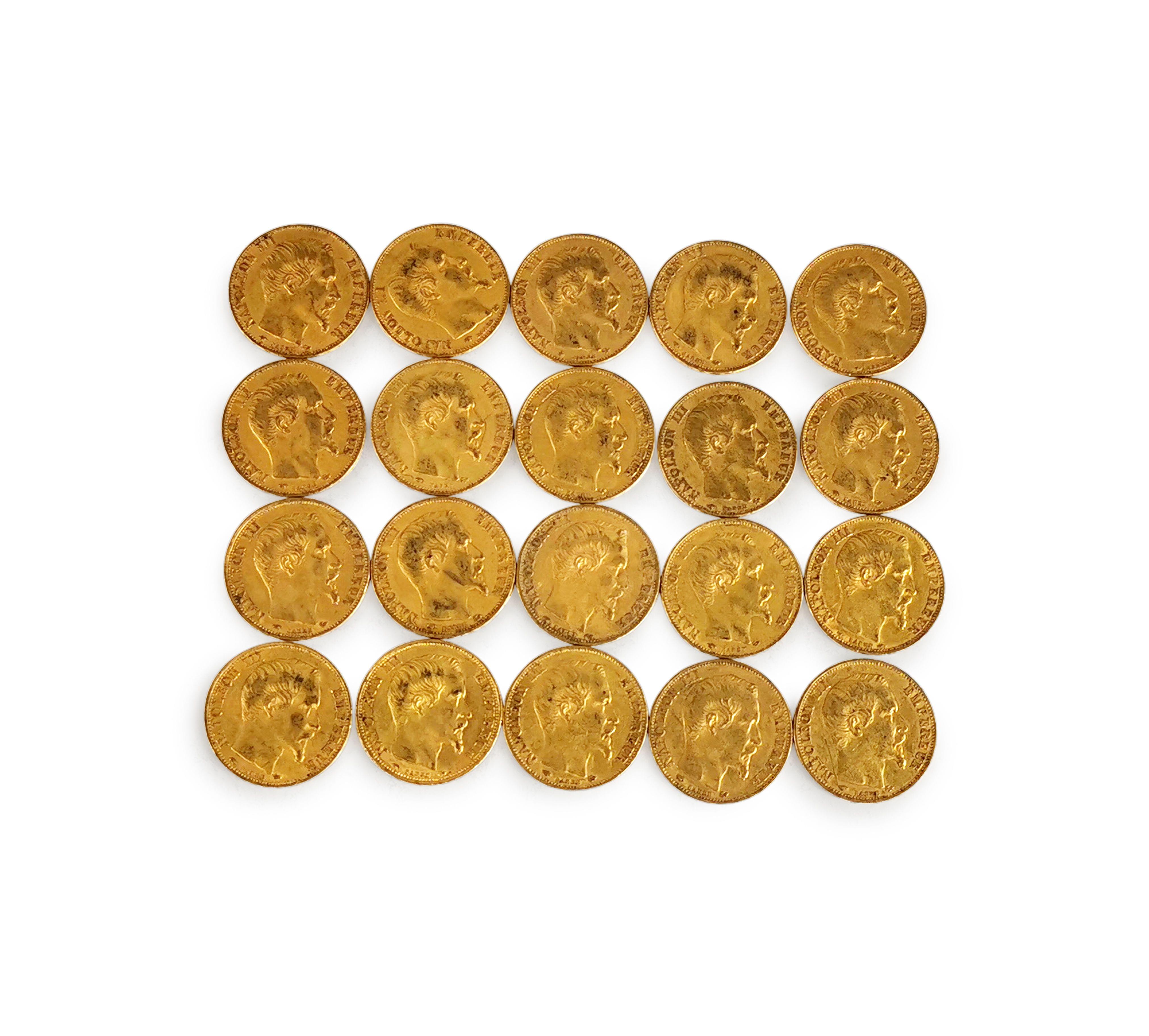 4364. Lot de vingt pièces de 20 francs Napoléon III (tête nue)