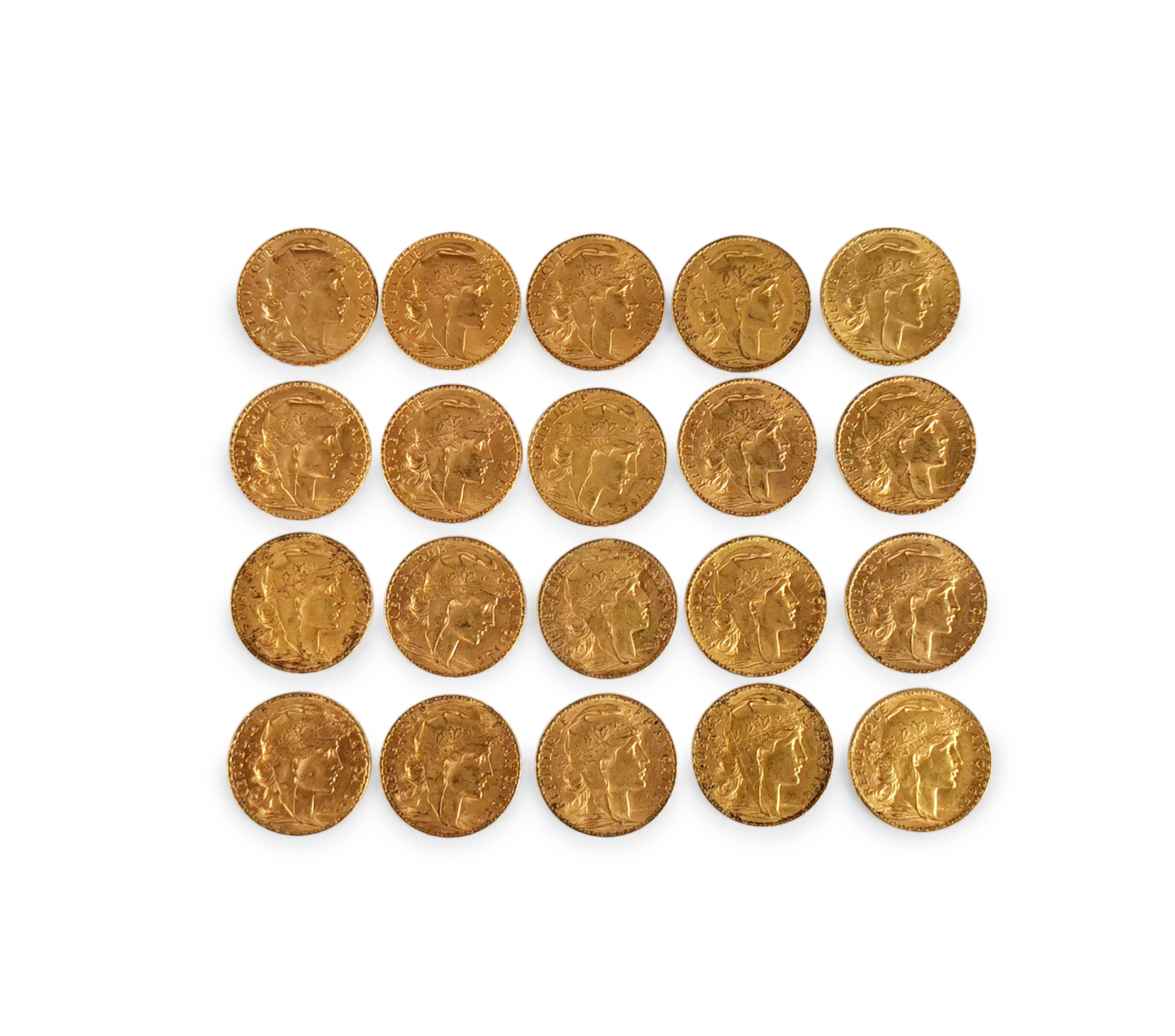 4378. Lot de vingt pièces de 20 francs Coq (Liberté, égalité, fraternité)