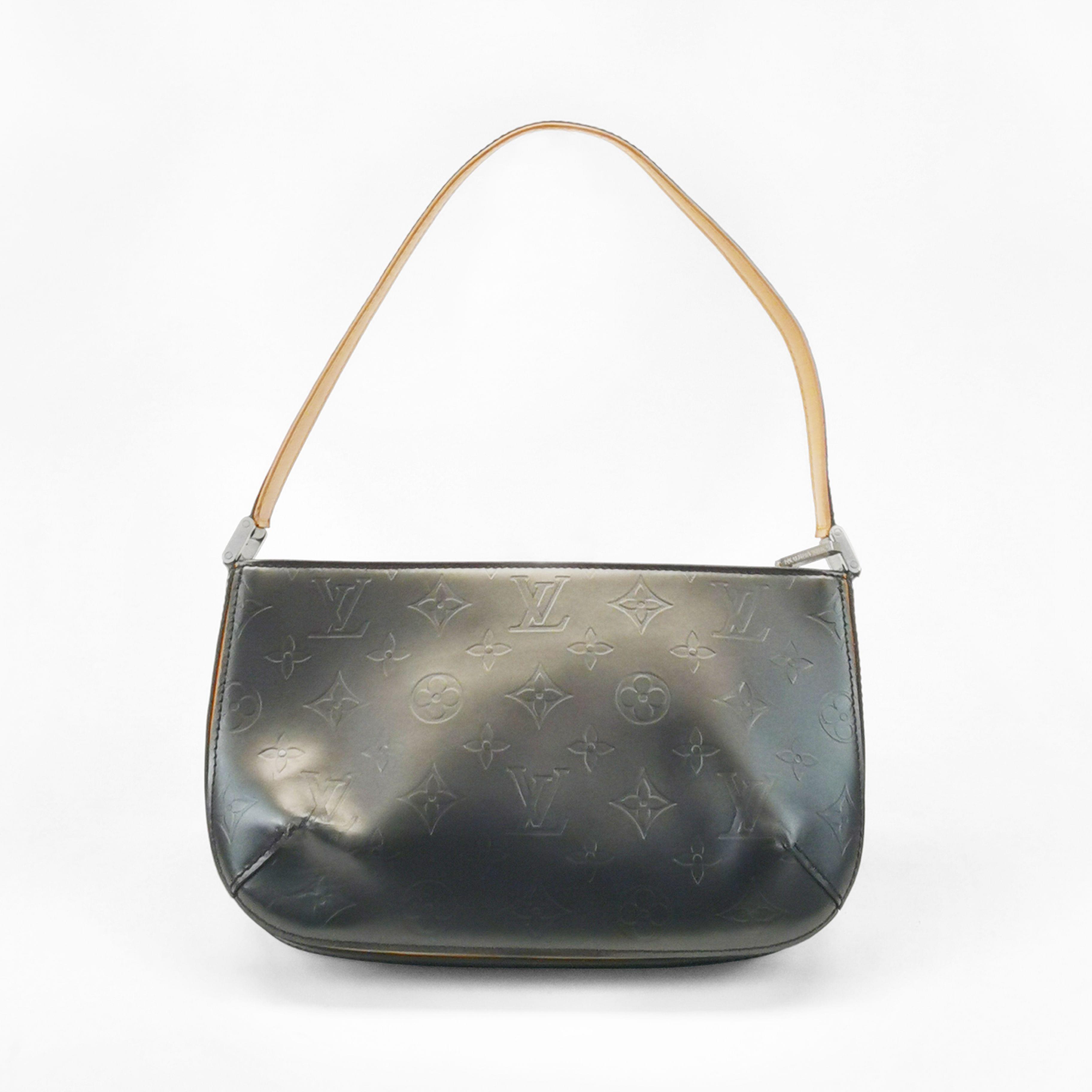 Toile Monogram gris anthracite à effet glacé et surpiqûres camel, anse, fermeture zippée, 16x26x3 cm