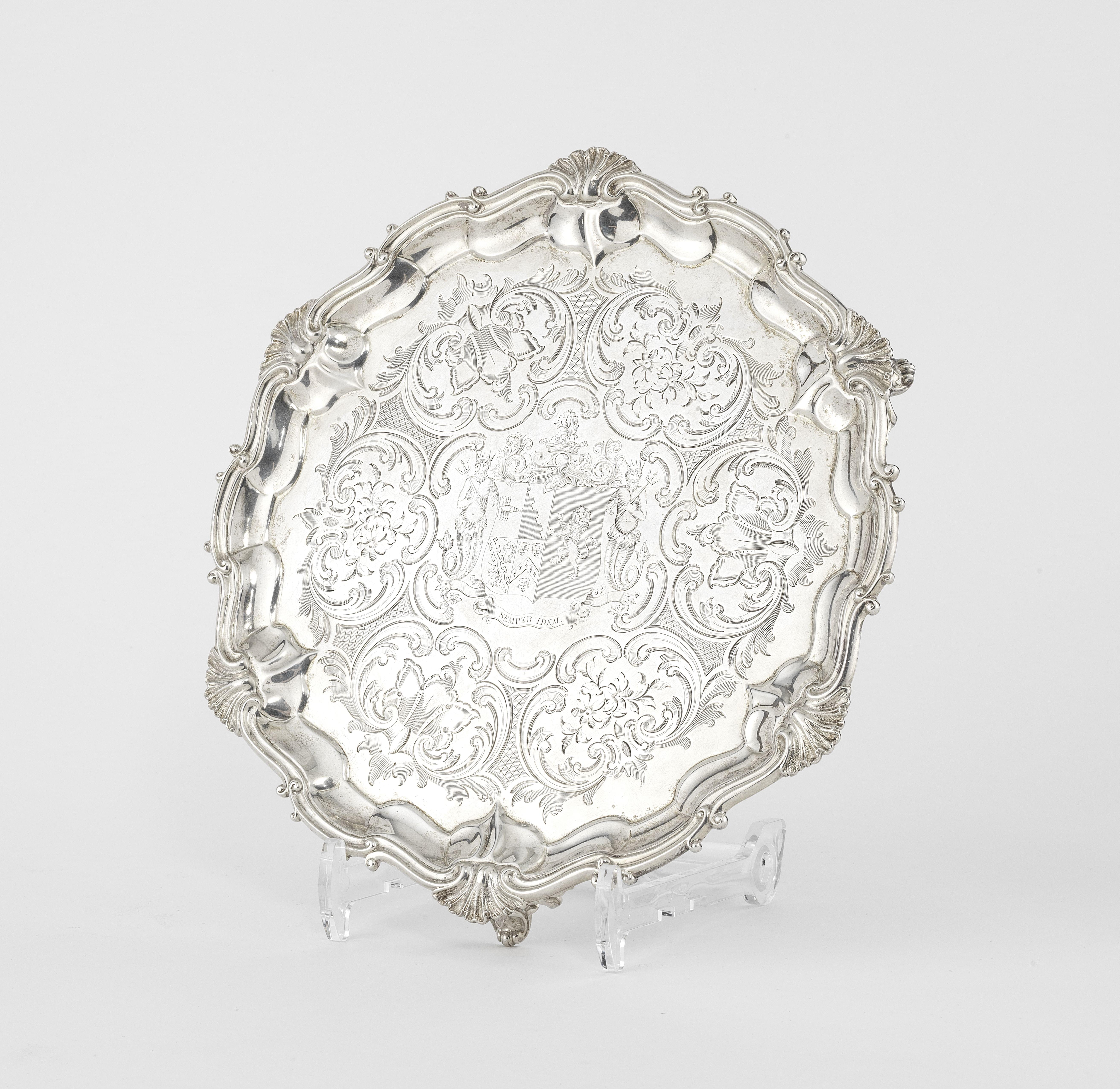 4528. Plateau de présentation tripode d'époque victorienne à décor d'armoiries et rinceaux