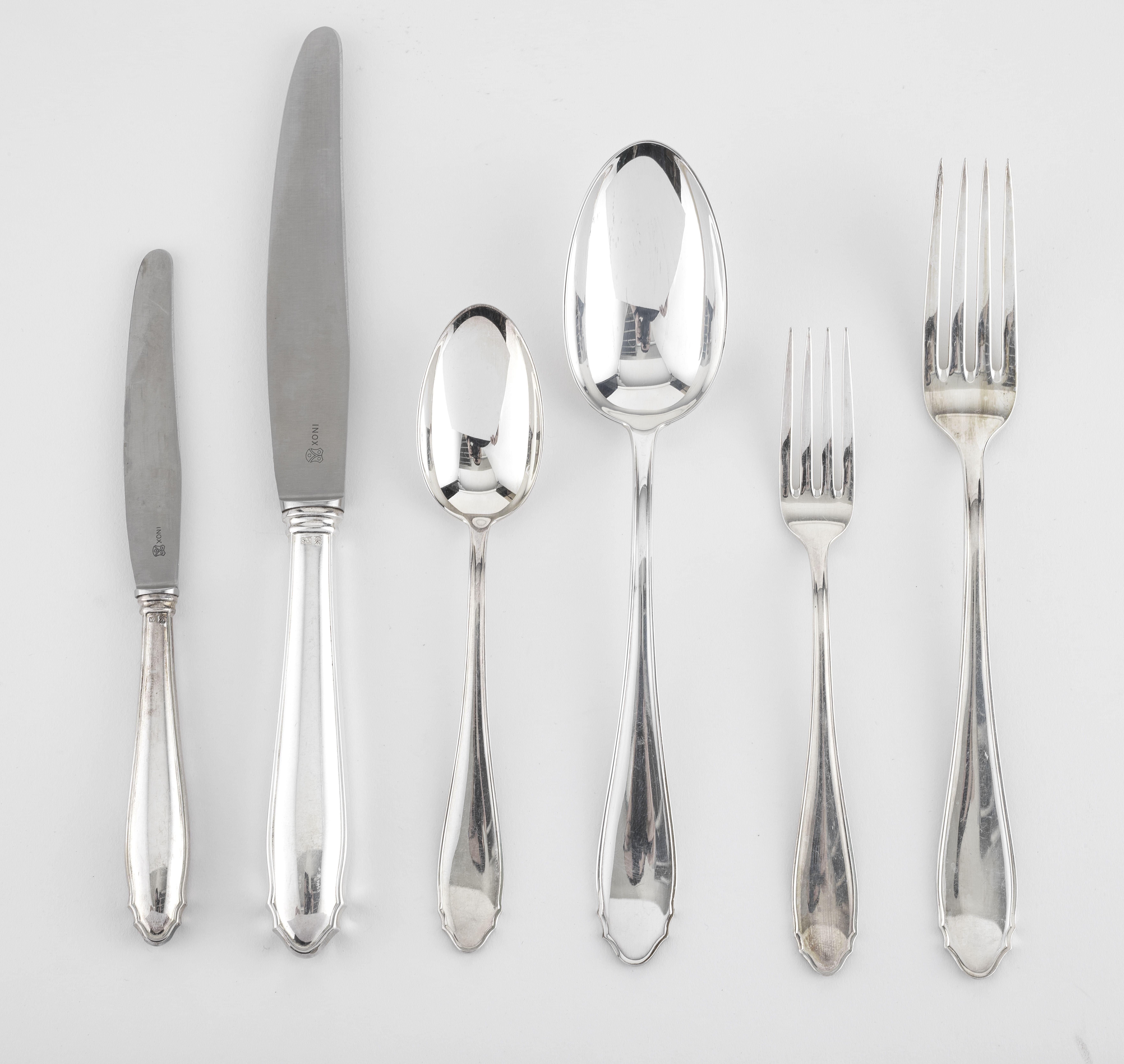 Jezler, argent 800 comprenant 12 cuillères et 12 couteaux à dîner, 12 fourchettes, 12 cuillères et 12 couteaux à entremets, 3 pièces de service, 2300 g