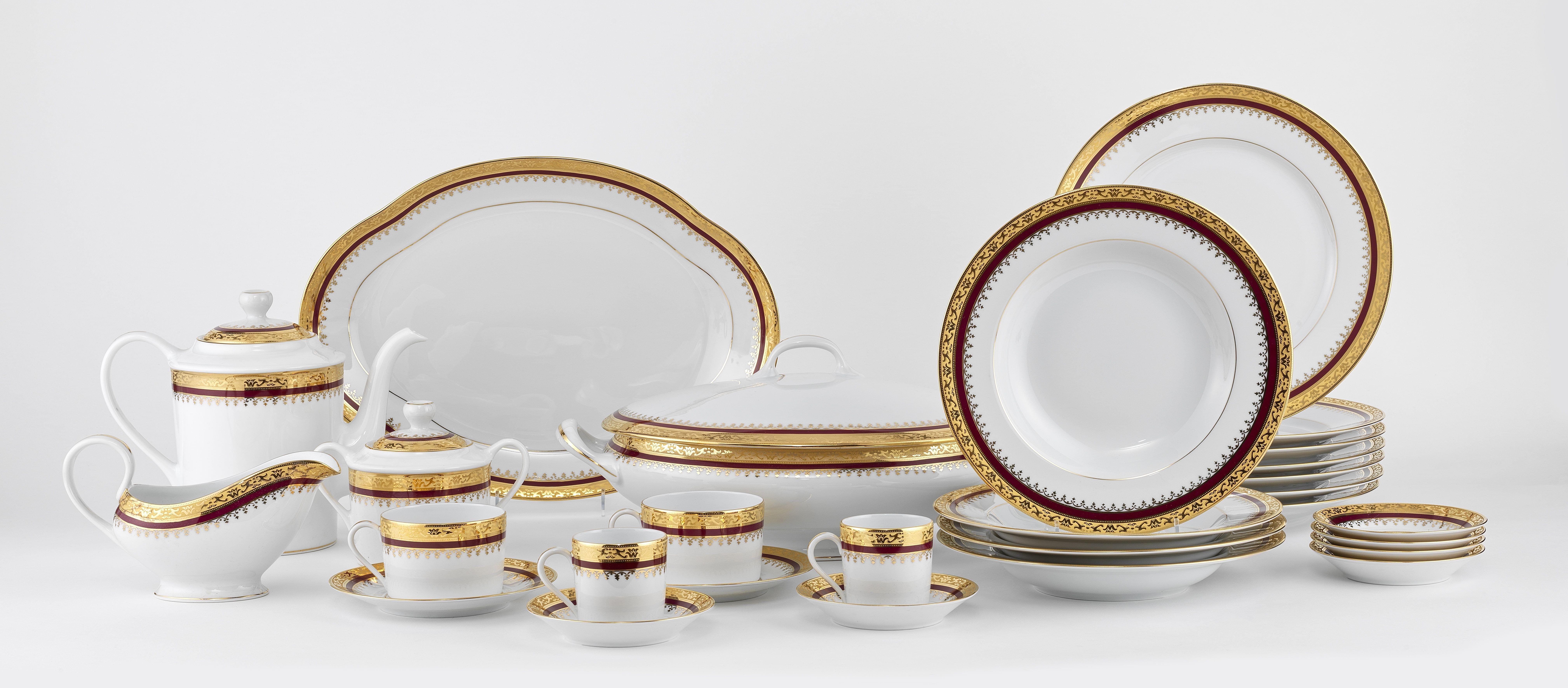 4608. Service à dîner à filet rouge et bandeau de losanges en or mat brillant