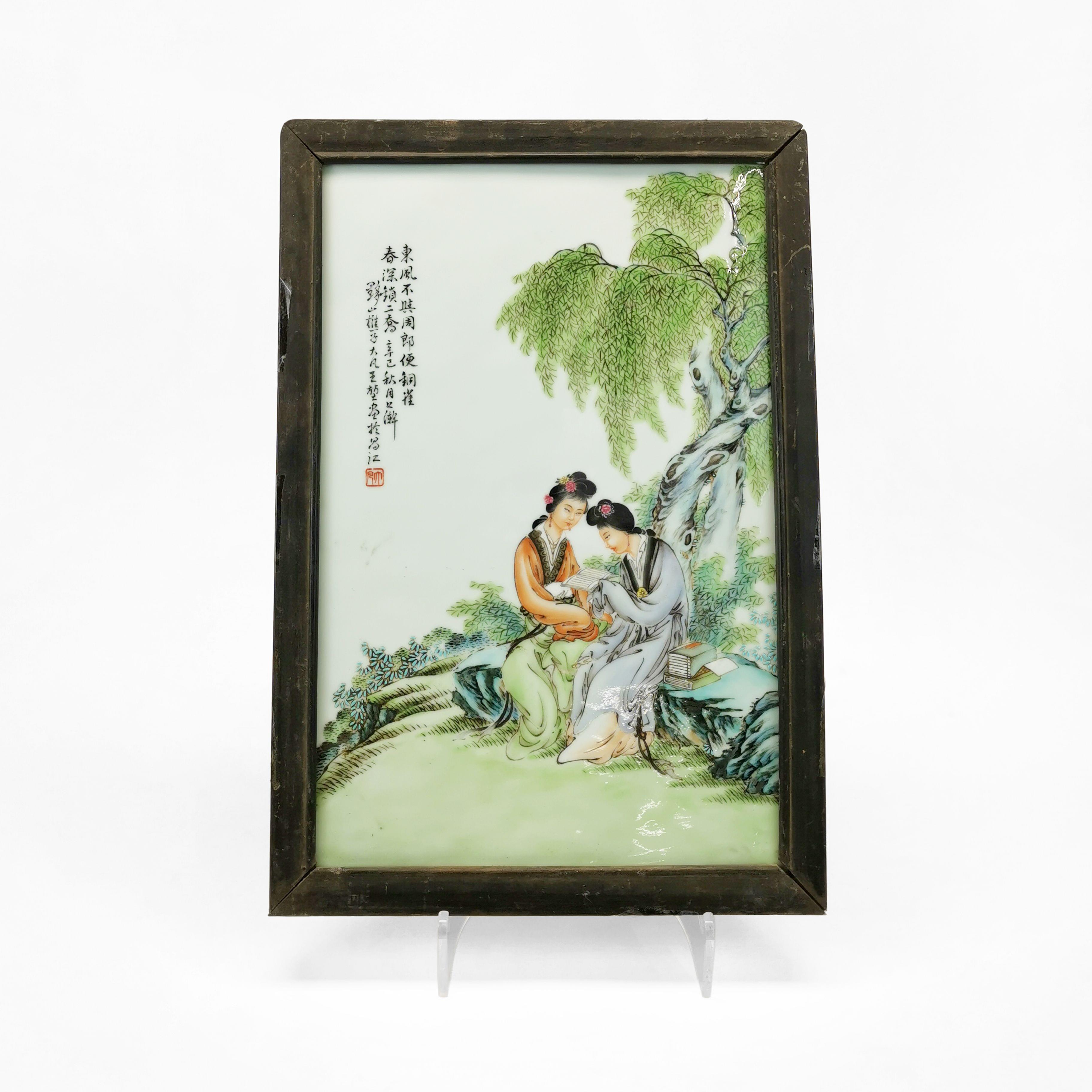Porcelaine émaillée polychrome à décor de personnages et d'un poème, 37x24 cm