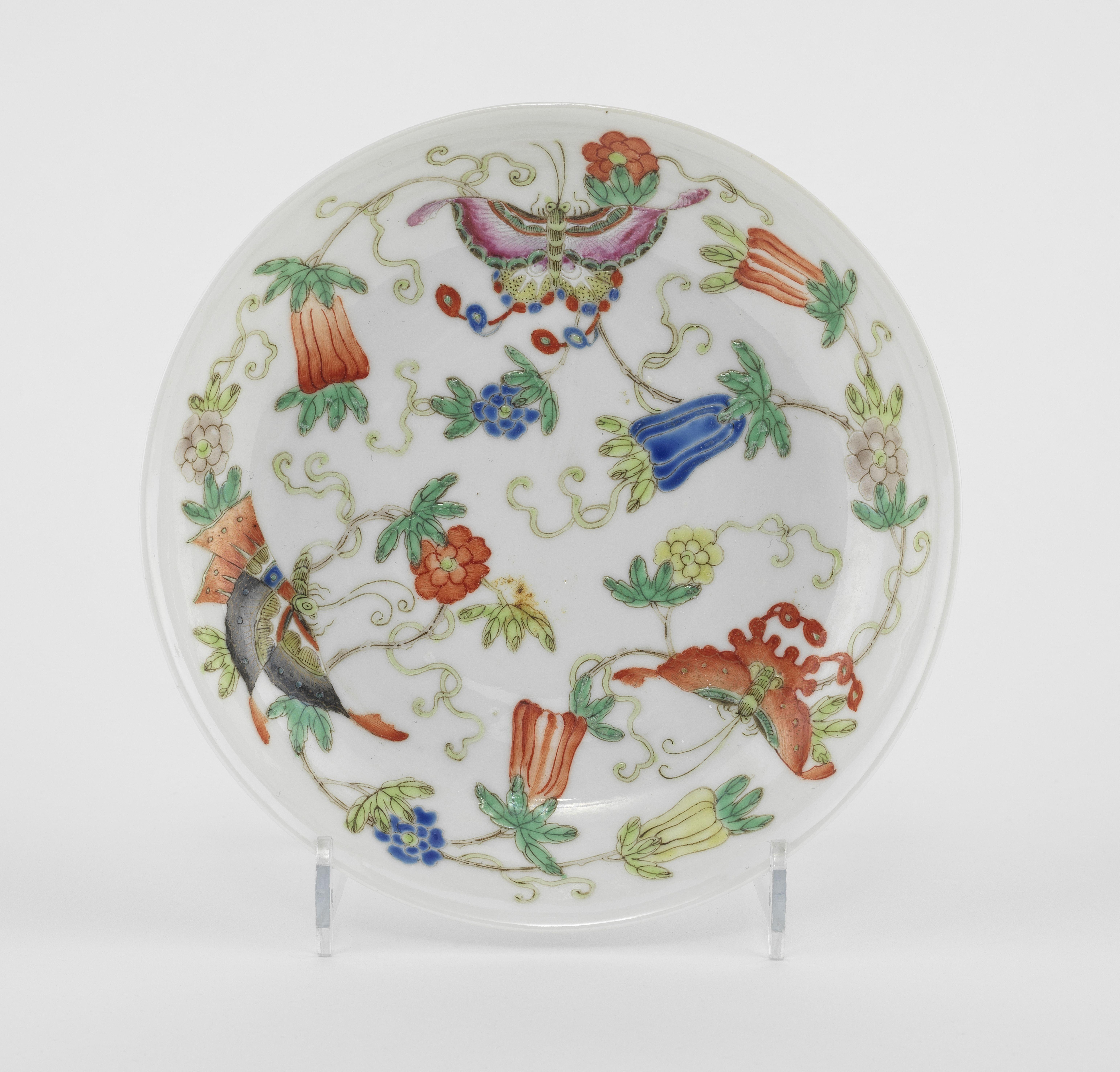 Porcelaine émaillée polychrome à décor d'oiseaux et papillons, D 14 cm