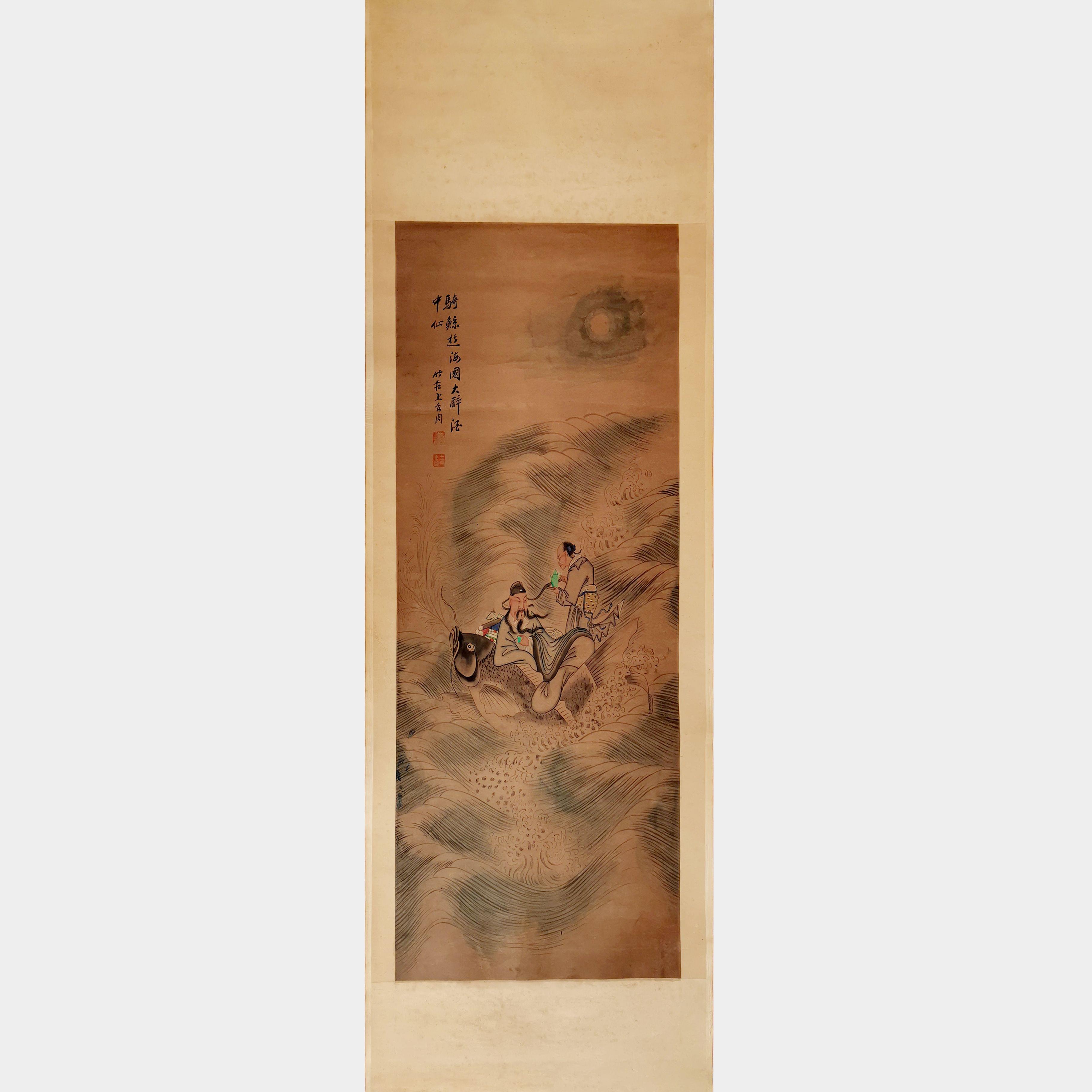 L’immortel taoïste Kinko prenant un thé sur sa carpe, encre sur papier, montée en rouleau, 105x45 cm