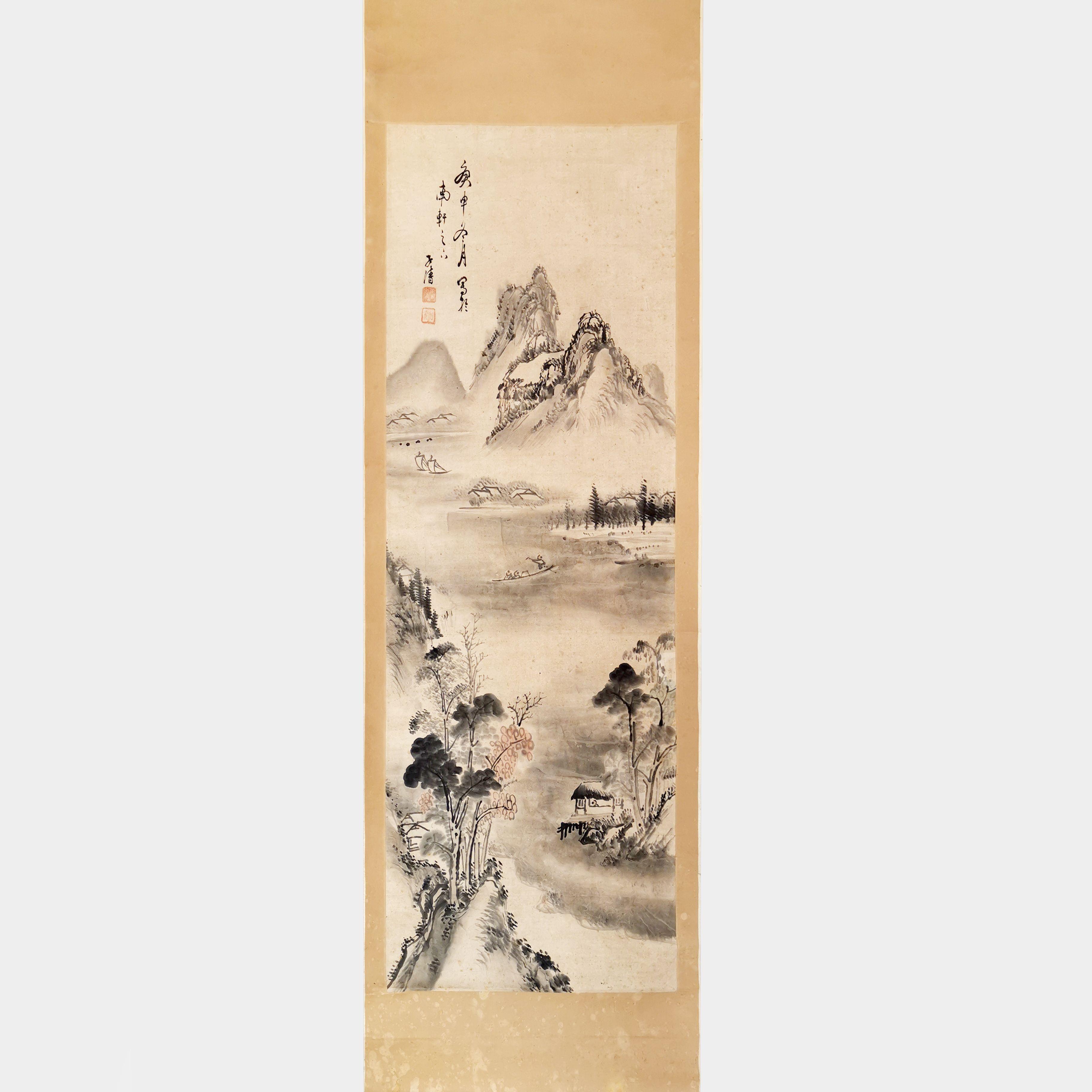 Paysage lacustre animé, montée en rouleau, 119x46 cm
