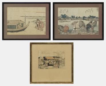 - Le nouveau pont des saules sous l'averse- Deux amants s'échappant vers une embarcation- Princesse de haut rang dans un palanquin, trois estampes dont deux surimonos, 14x20 et 20x30 cm. Provenance: château de Russin