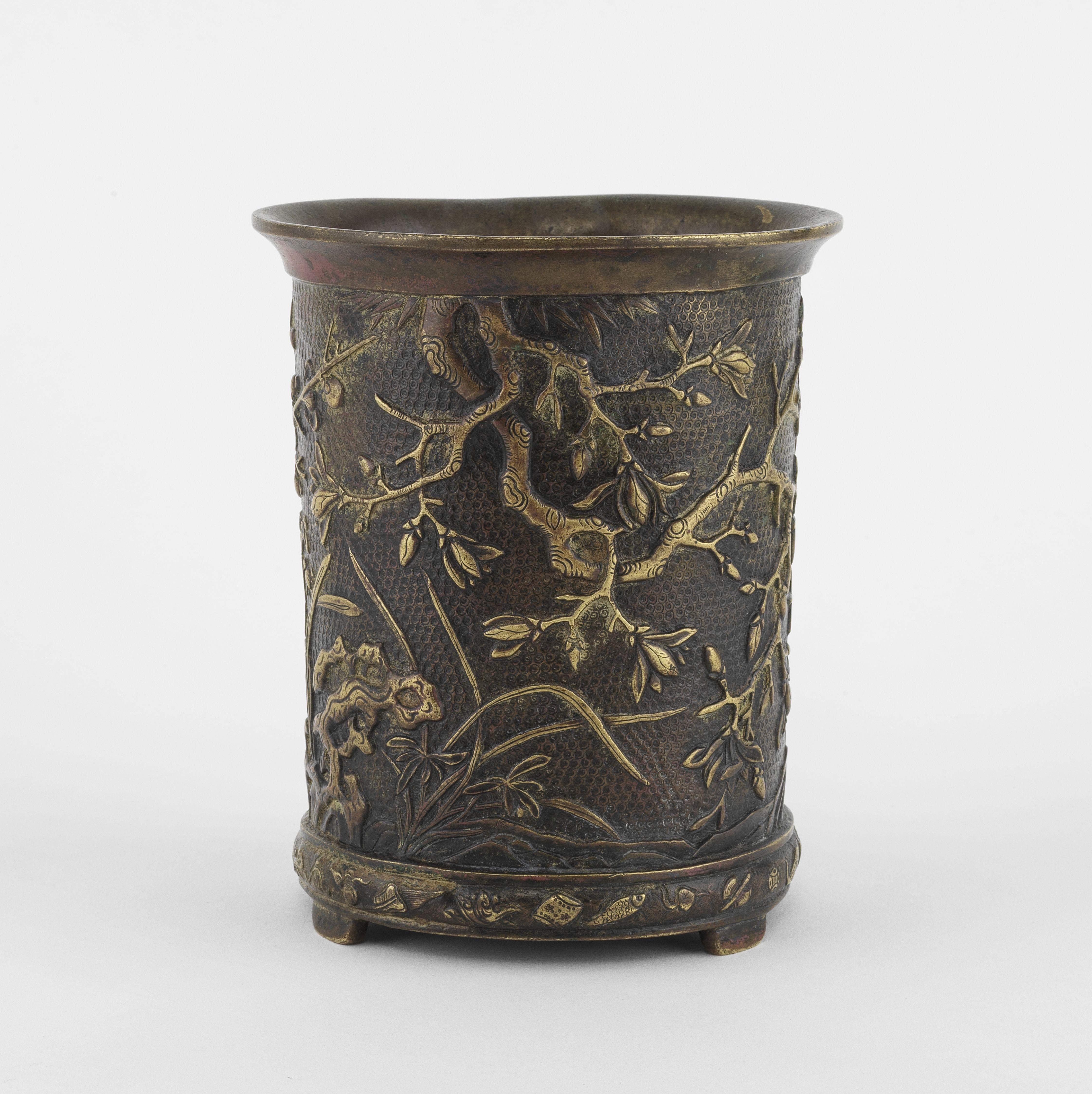 Bronze patiné et doré à décor de branches fleuries, H 15,5 cm