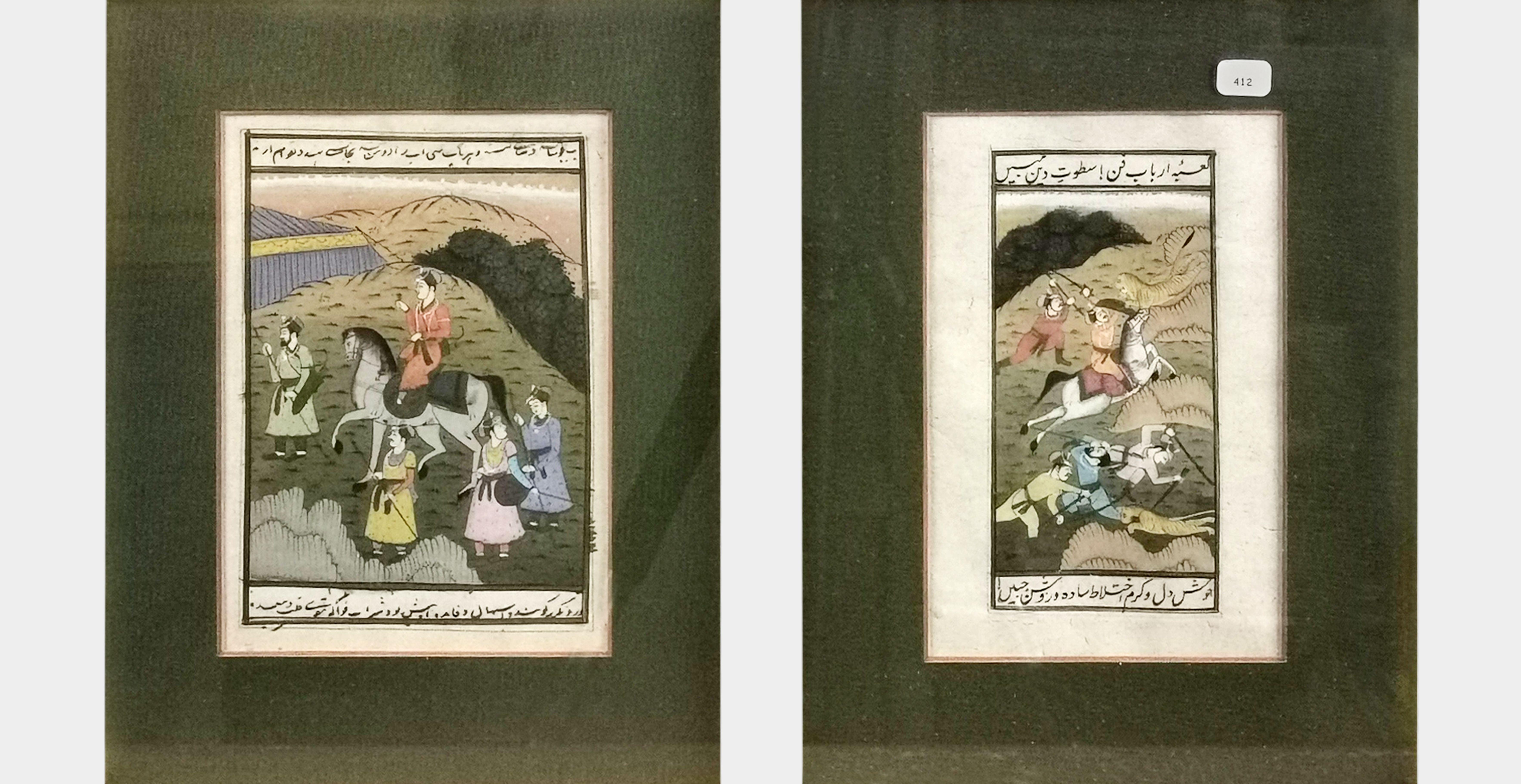Paysages animés de personnages, gouaches et encres sur papier, 18x14 et 18x12