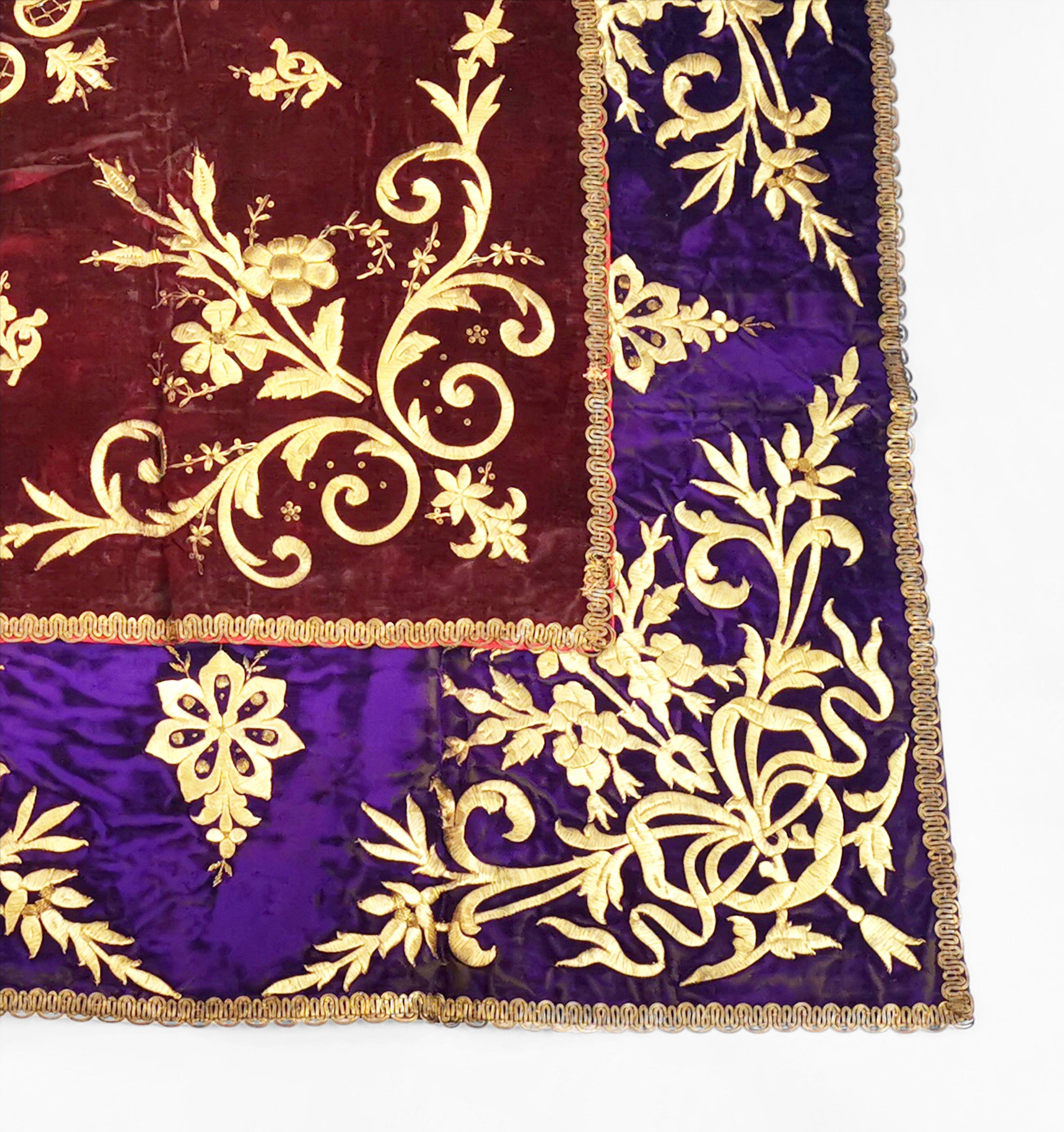 Soie et fils dorés à motifs de rinceaux sur fond pourpre, 84x84 cm