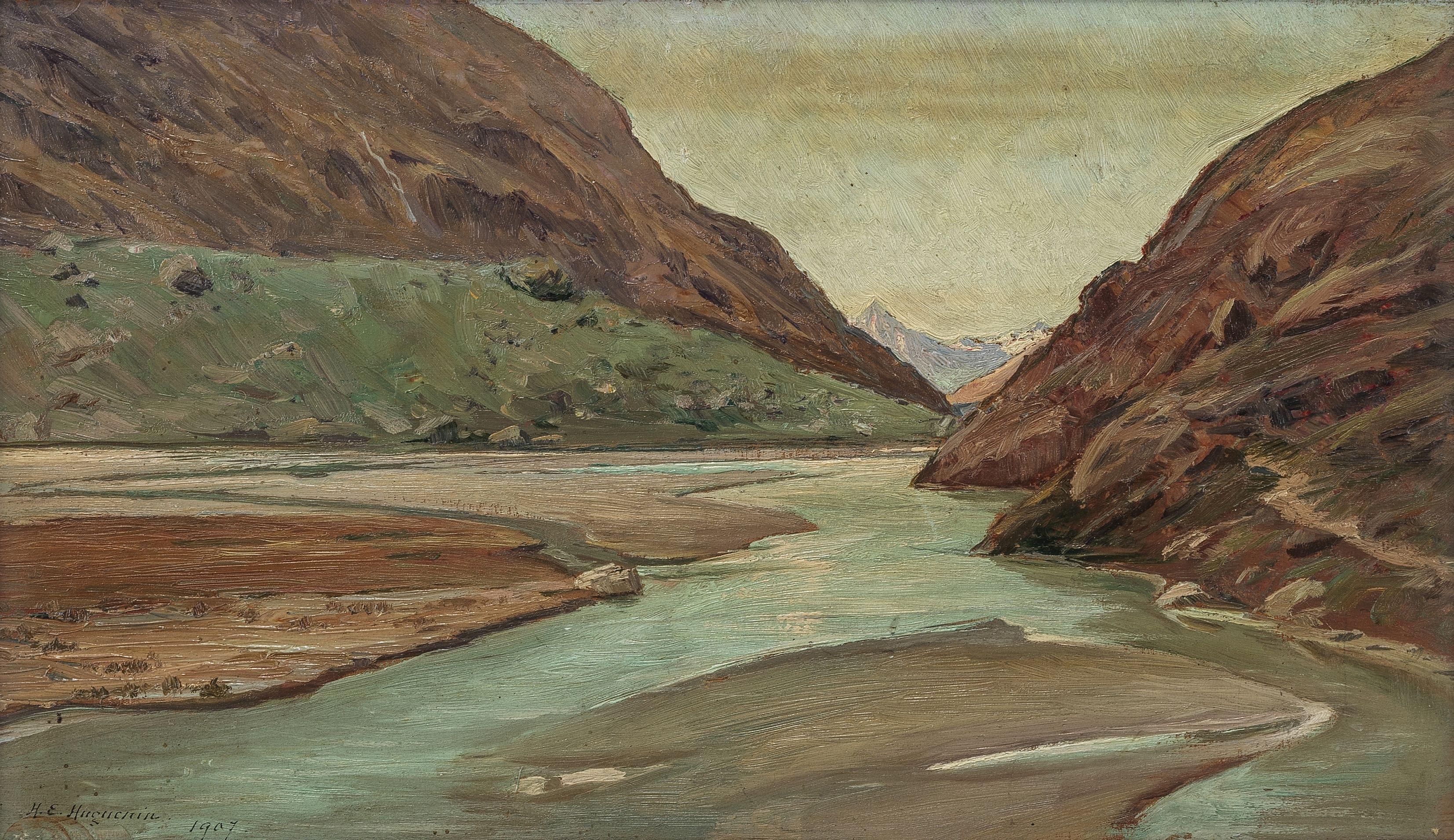 Vue du lac de Mattmark, huile sur panneau, signée et datée 1907, 19x33 cm