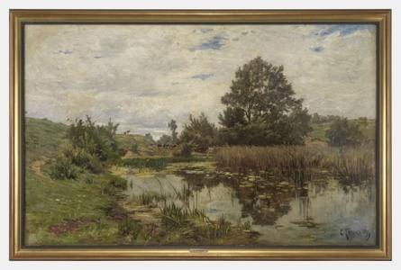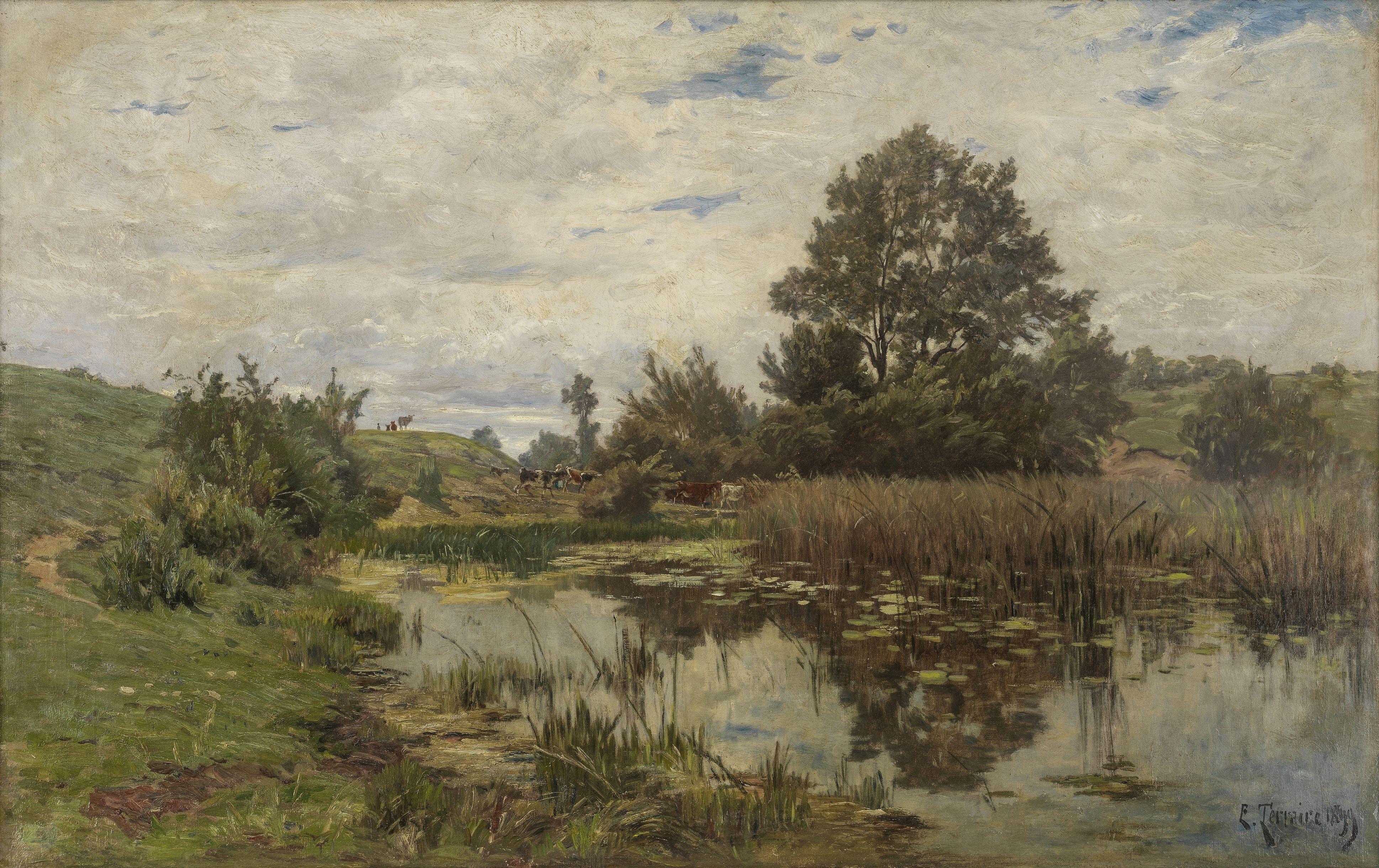 Etang animé de vaches, huile sur toile, signée et datée 1899, 73x115 cm